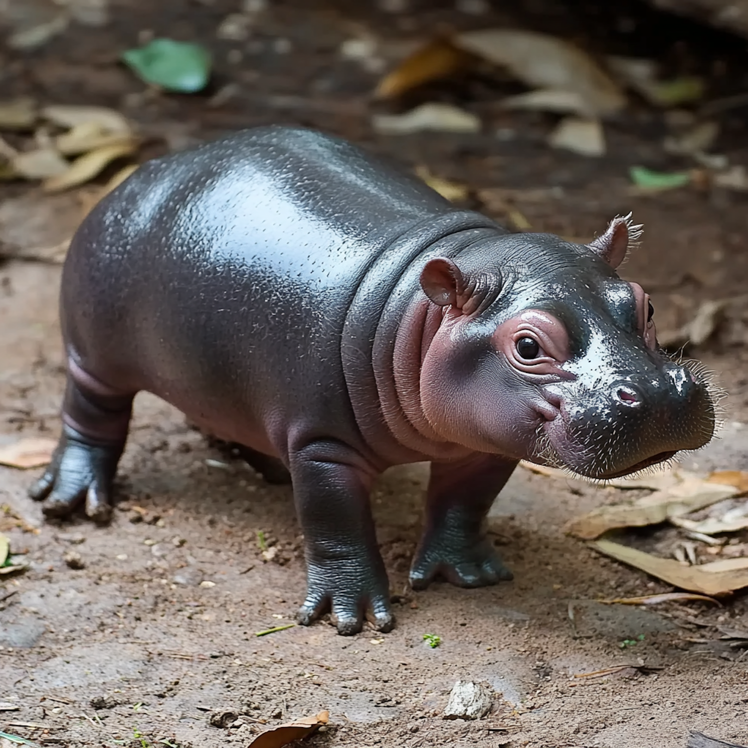 Adorable baby pygmy hippo with shiny skin stands on a dirt ground, surrounded by dry leaves. Its wide eyes and small ears add to its charm.