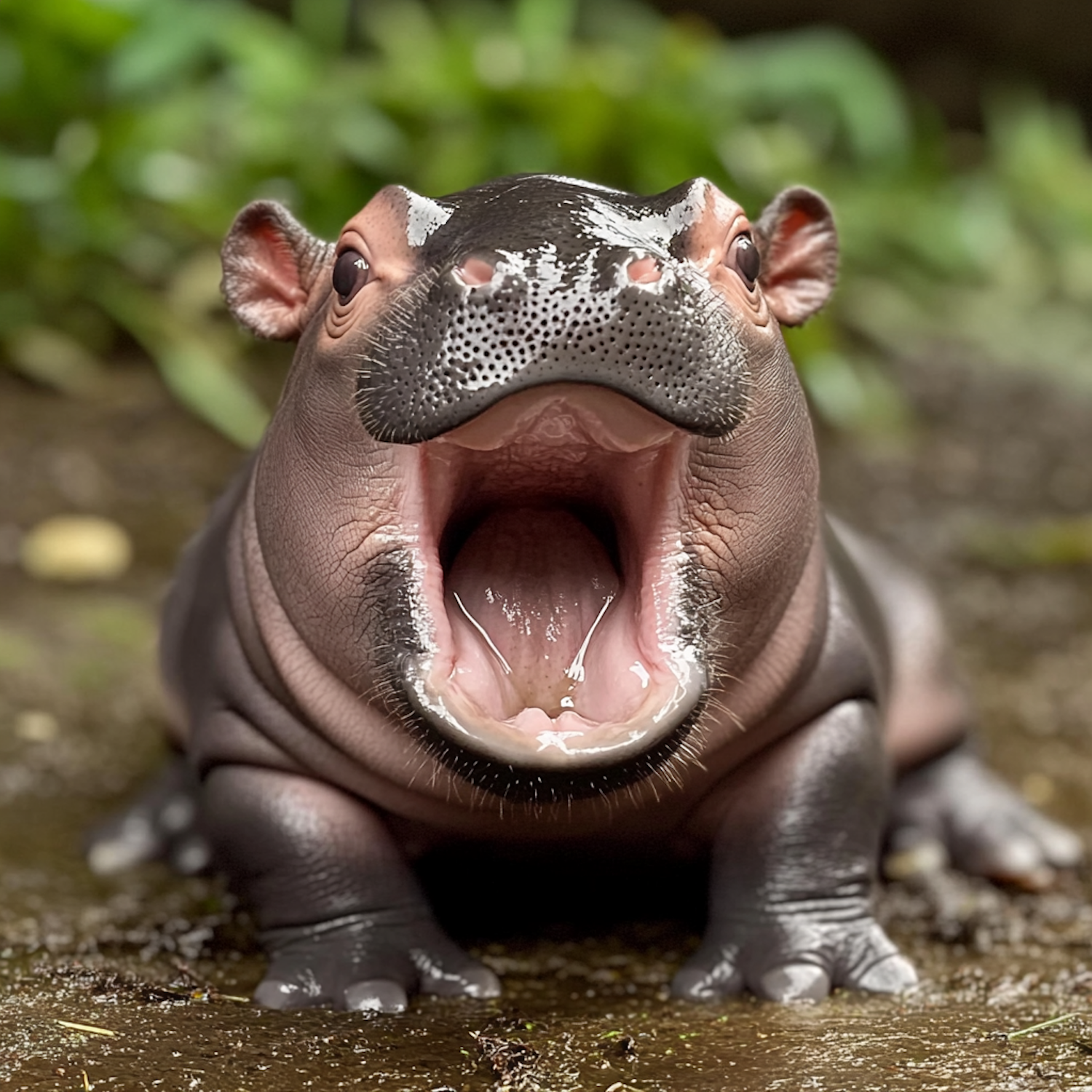 Adorable baby hippo with mouth wide open, sitting on wet ground with blurred green leaves in the background.