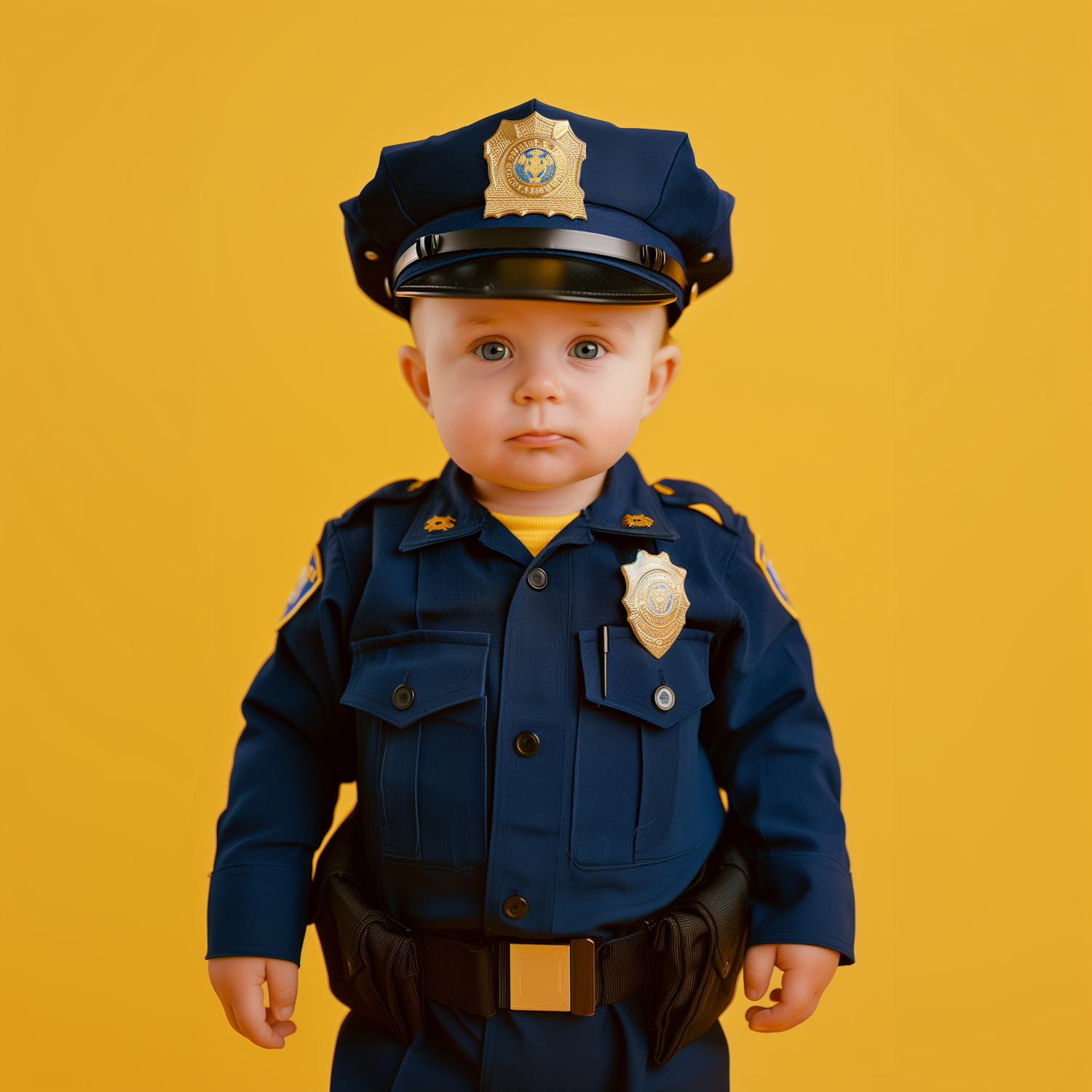 Adorable child in a police uniform against a bright yellow background, showcasing a cute and humorous contrast.
