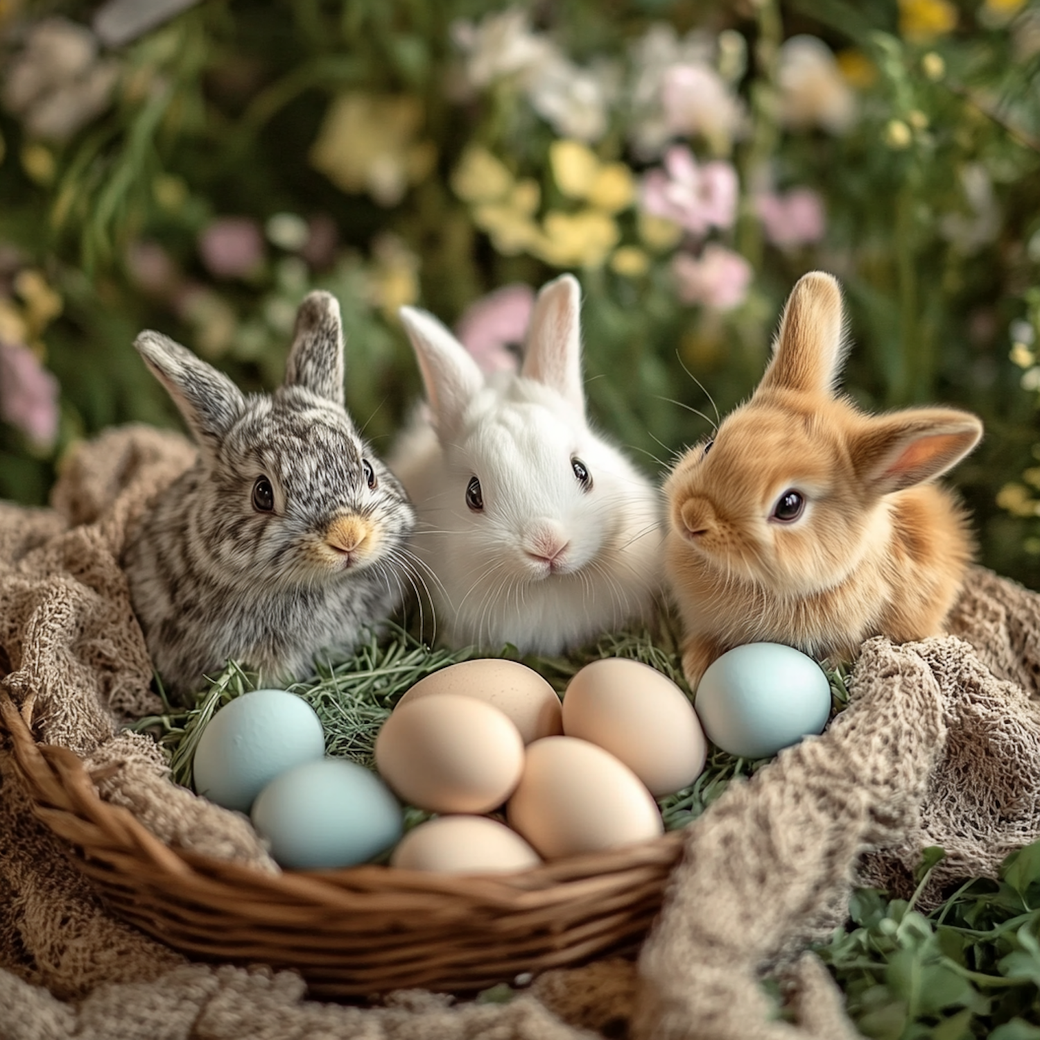 Three cute baby bunnies with a basket of pastel eggs, surrounded by spring flowers and greenery in a cozy, rustic setting.