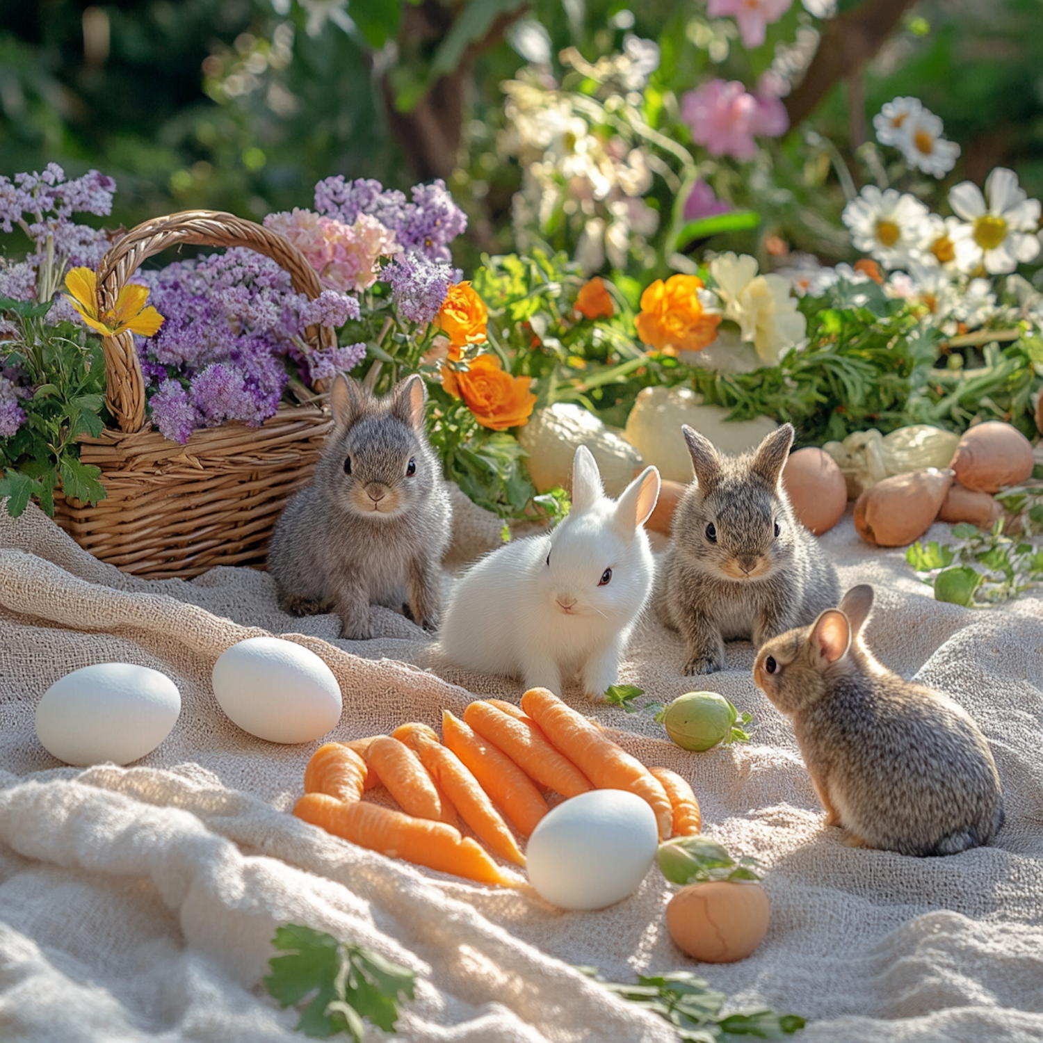 Adorable baby rabbits surrounded by carrots, eggs, and flowers in a sunny garden setting. Perfect for spring or Easter vibes!