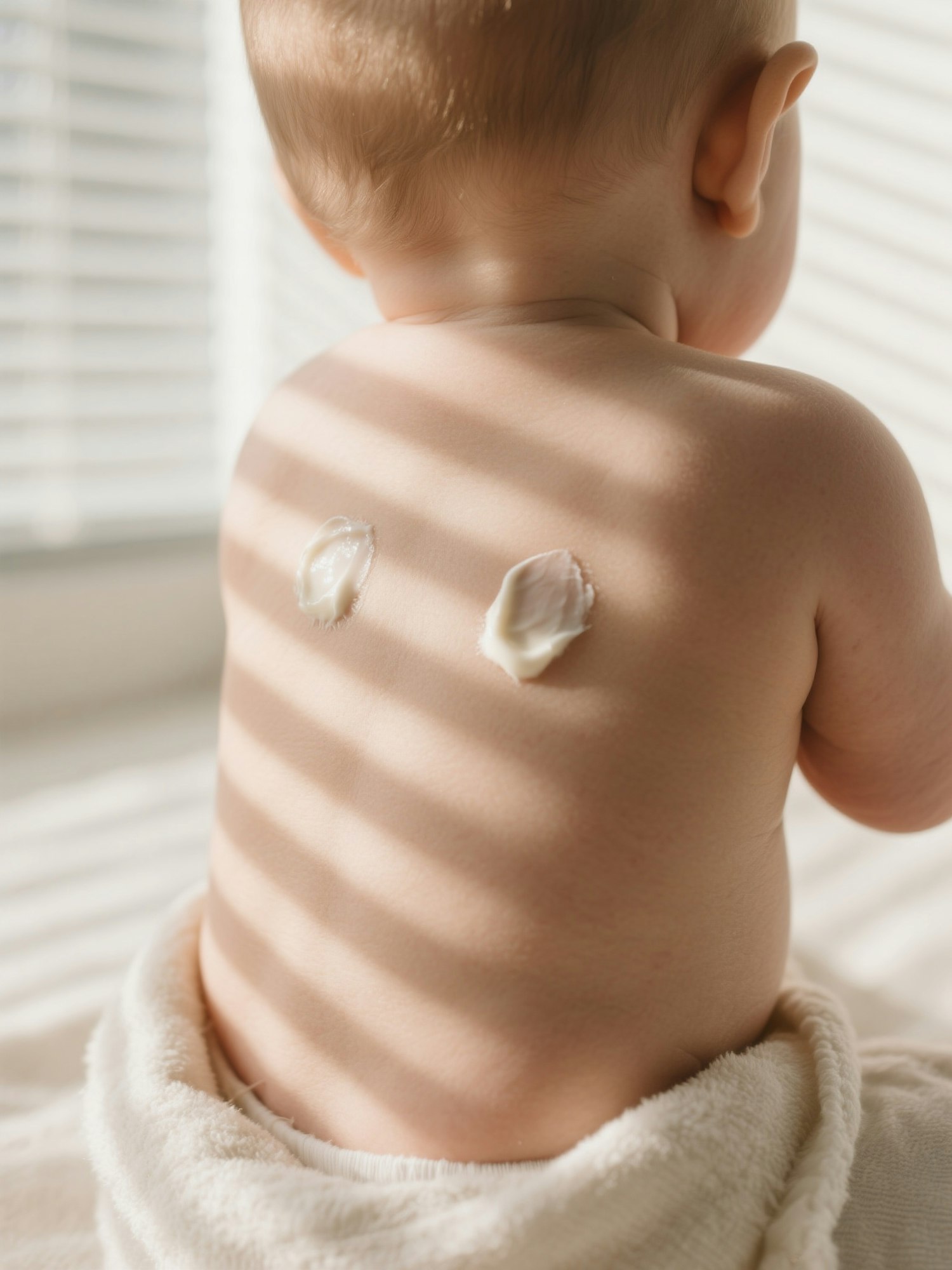 A soft and minimalistic baby-themed photoshoot in natural lighting. Neutral tones, beige and white color palette, cozy atmosphere, clean background, soft textures and warm skin tones. High-quality photography inspired by Scandinavian baby aesthetics. A close-up of a baby’s back with two small patches of cream on the shoulder, sunlight filtered through blinds casting soft lines across the skin.