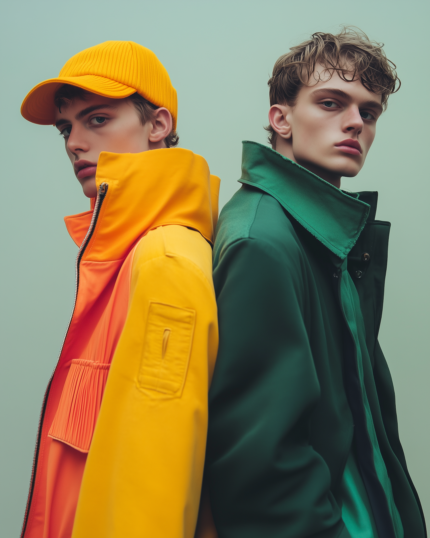 Two young men in vibrant yellow and green jackets stand back-to-back, exuding a modern and stylish vibe.