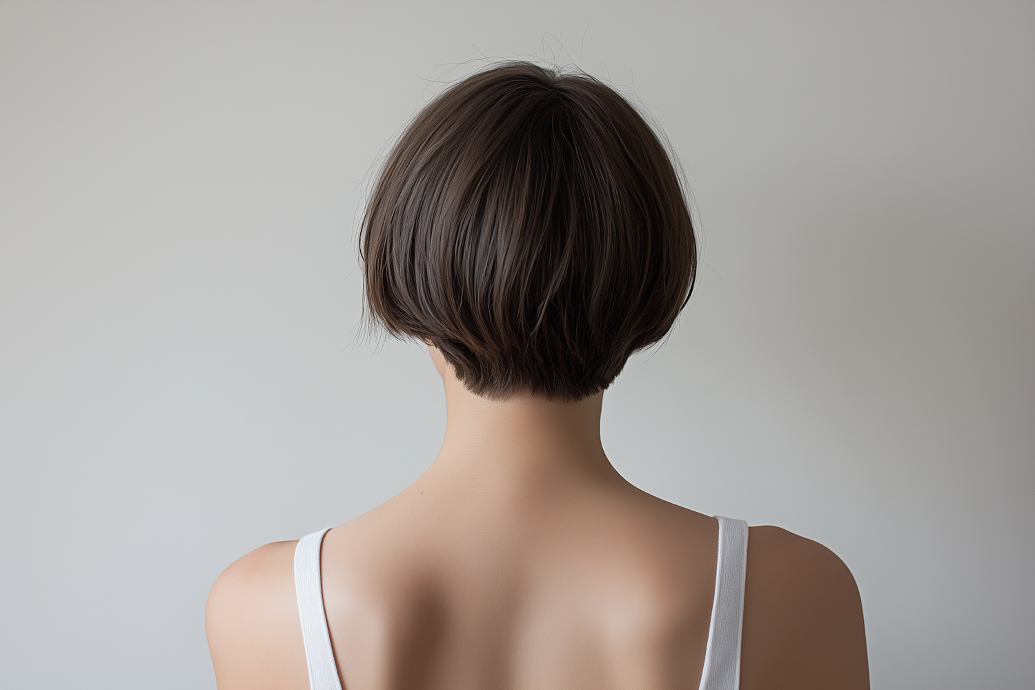Back view of a person with a neat bob haircut, light skin, and a white tank top against a plain background. Simple and elegant composition.