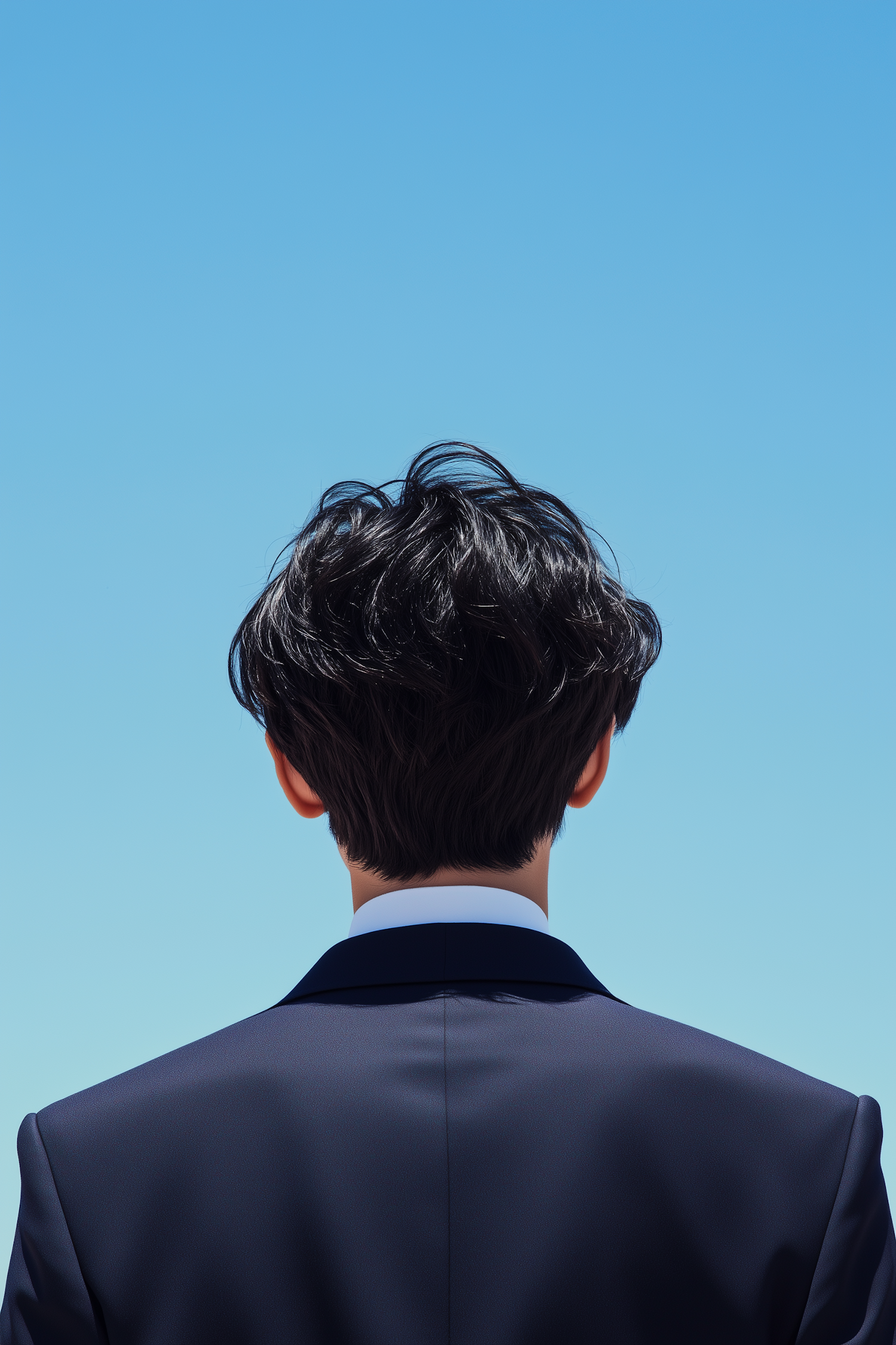 Back view of a person in a navy suit against a clear blue sky, showcasing wavy black hair and a crisp white shirt collar.