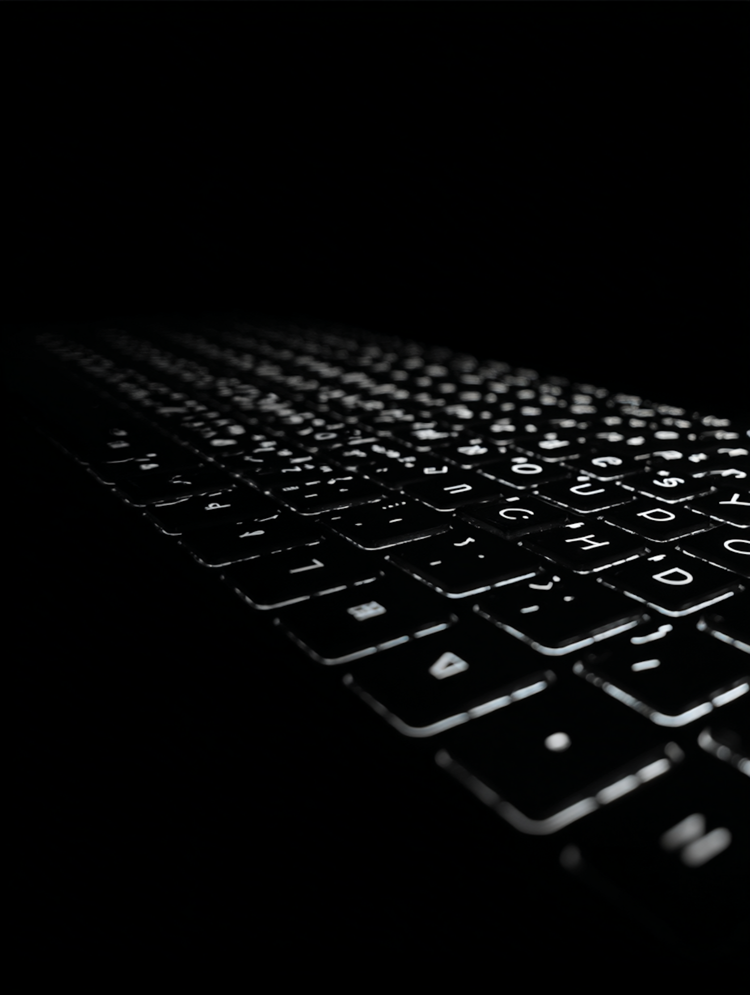 Close-up of a backlit keyboard glowing in the dark, showcasing illuminated keys with a sleek and modern aesthetic.