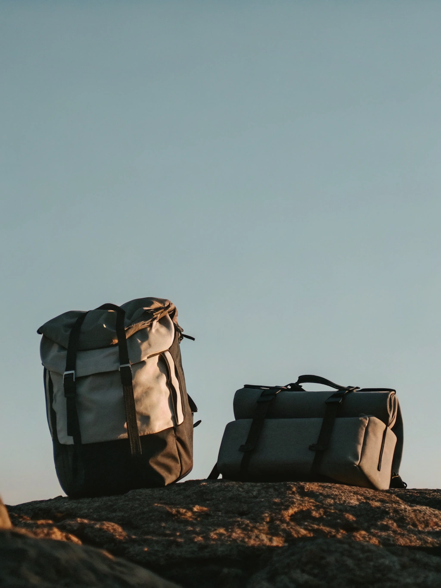 Two stylish backpacks on a rocky surface during golden hour, perfect for outdoor adventures and travel enthusiasts.