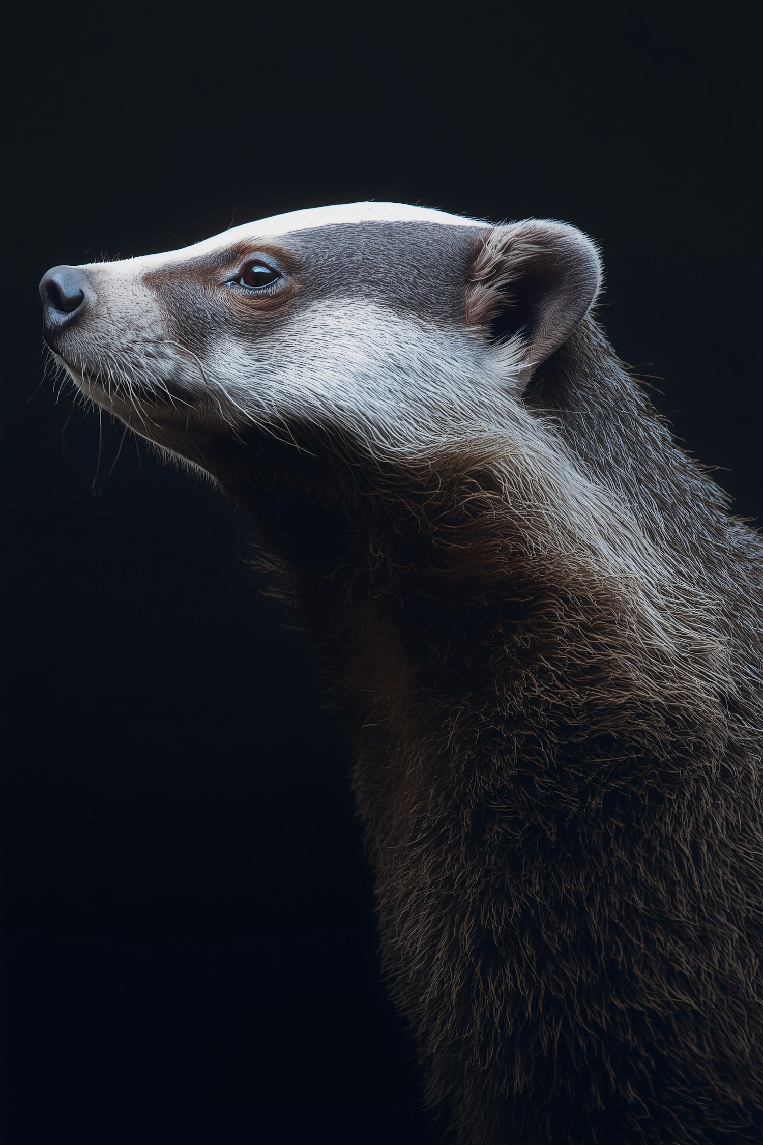 A striking side profile of a badger with detailed fur texture and dramatic lighting against a dark background.