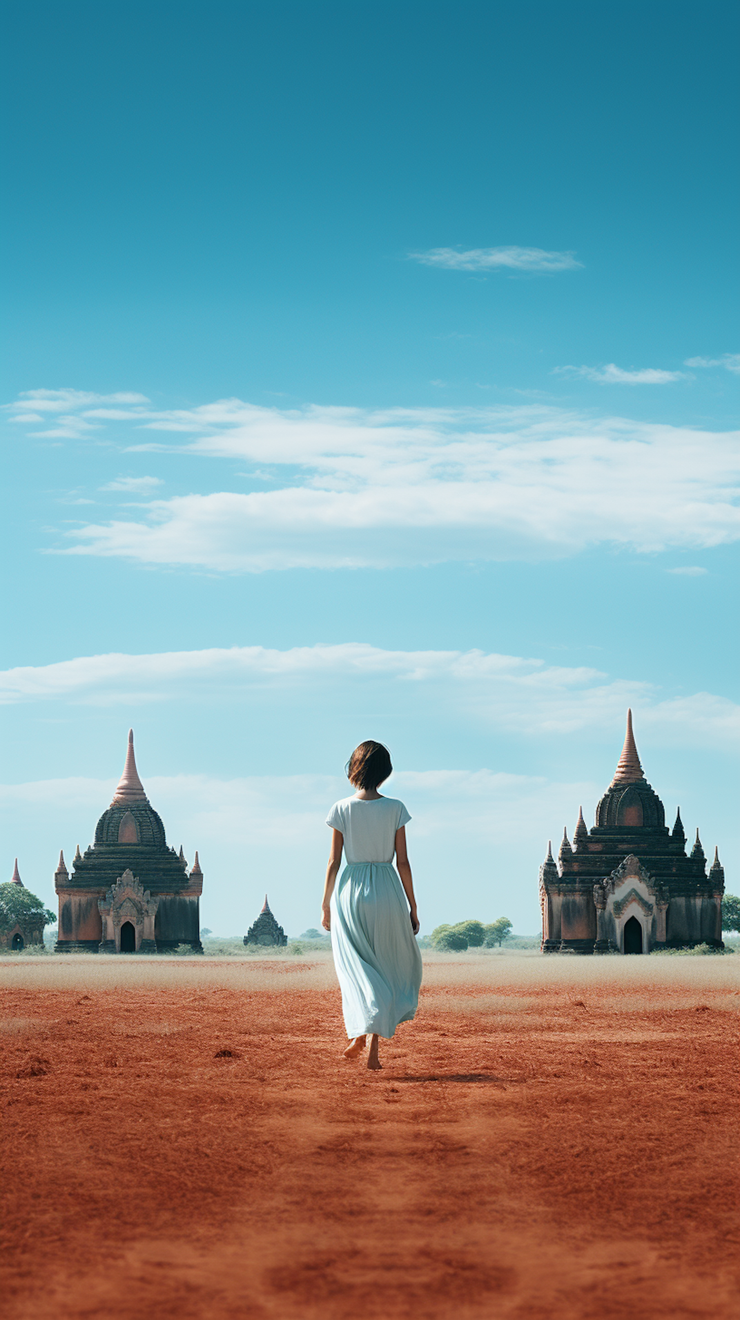 Woman in a blue dress walks towards ancient temples on a red plain under a clear blue sky, evoking a sense of exploration and tranquility.