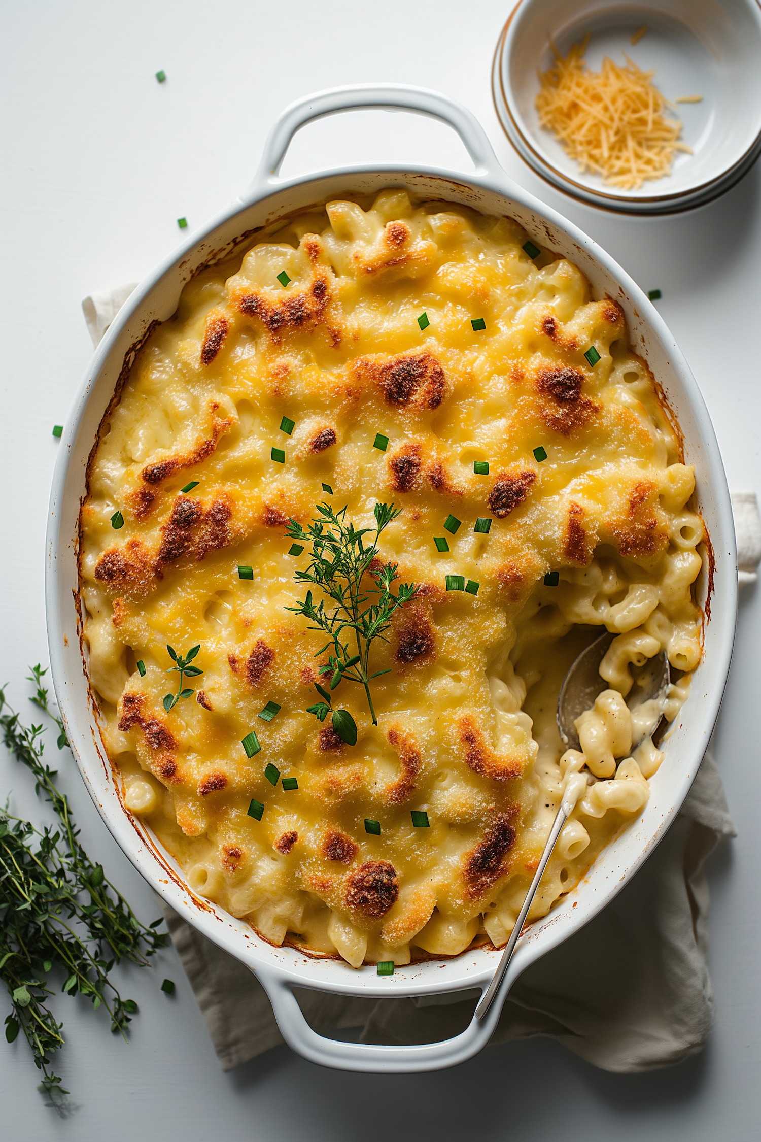 Golden baked macaroni and cheese with chives and thyme in a white dish, served with a side of shredded cheese.