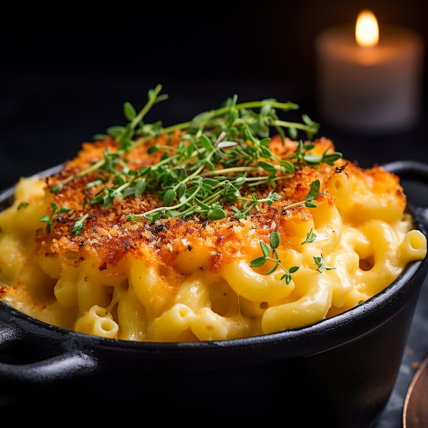 Creamy macaroni and cheese with a golden breadcrumb crust, topped with fresh herbs in a cozy candlelit setting.