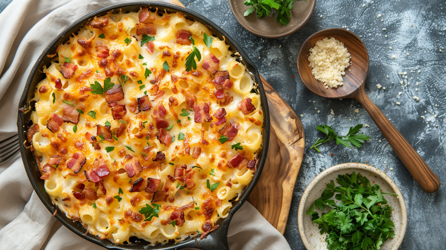 Golden baked mac and cheese with crispy bacon and parsley in a skillet, surrounded by fresh ingredients on a rustic surface.