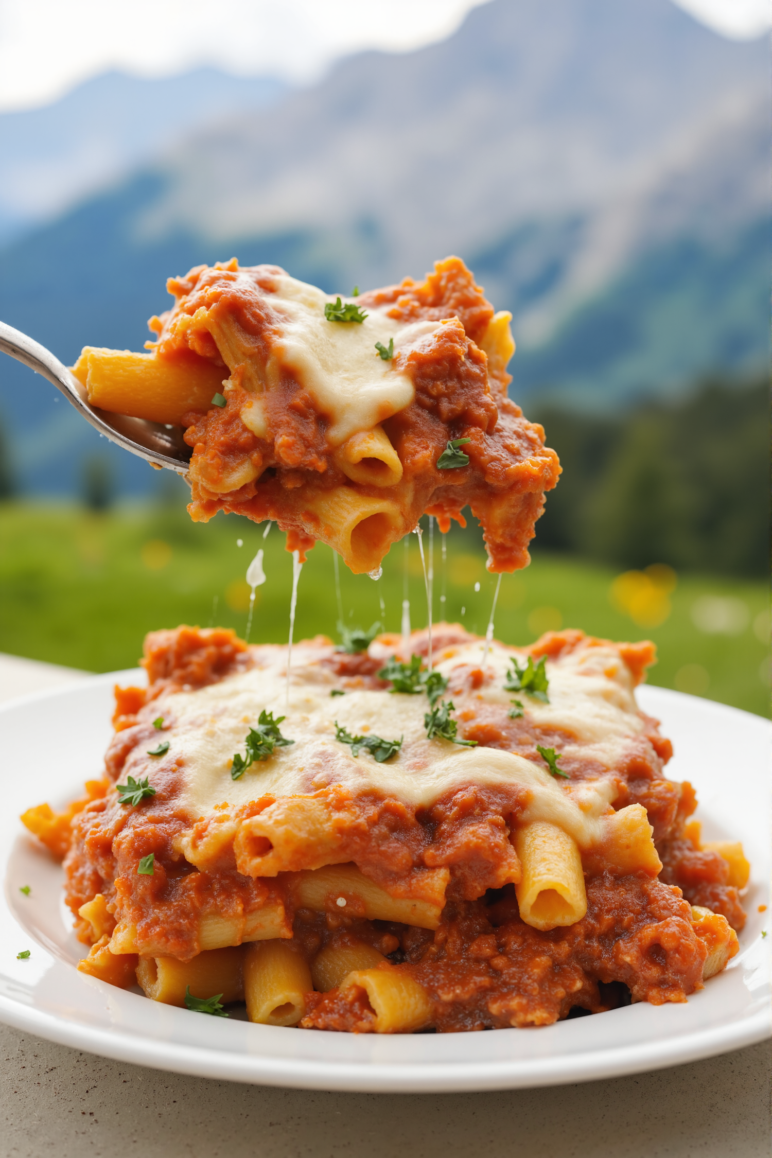 Delicious baked ziti with melted cheese and meat sauce, served with a scenic mountain view in the background.