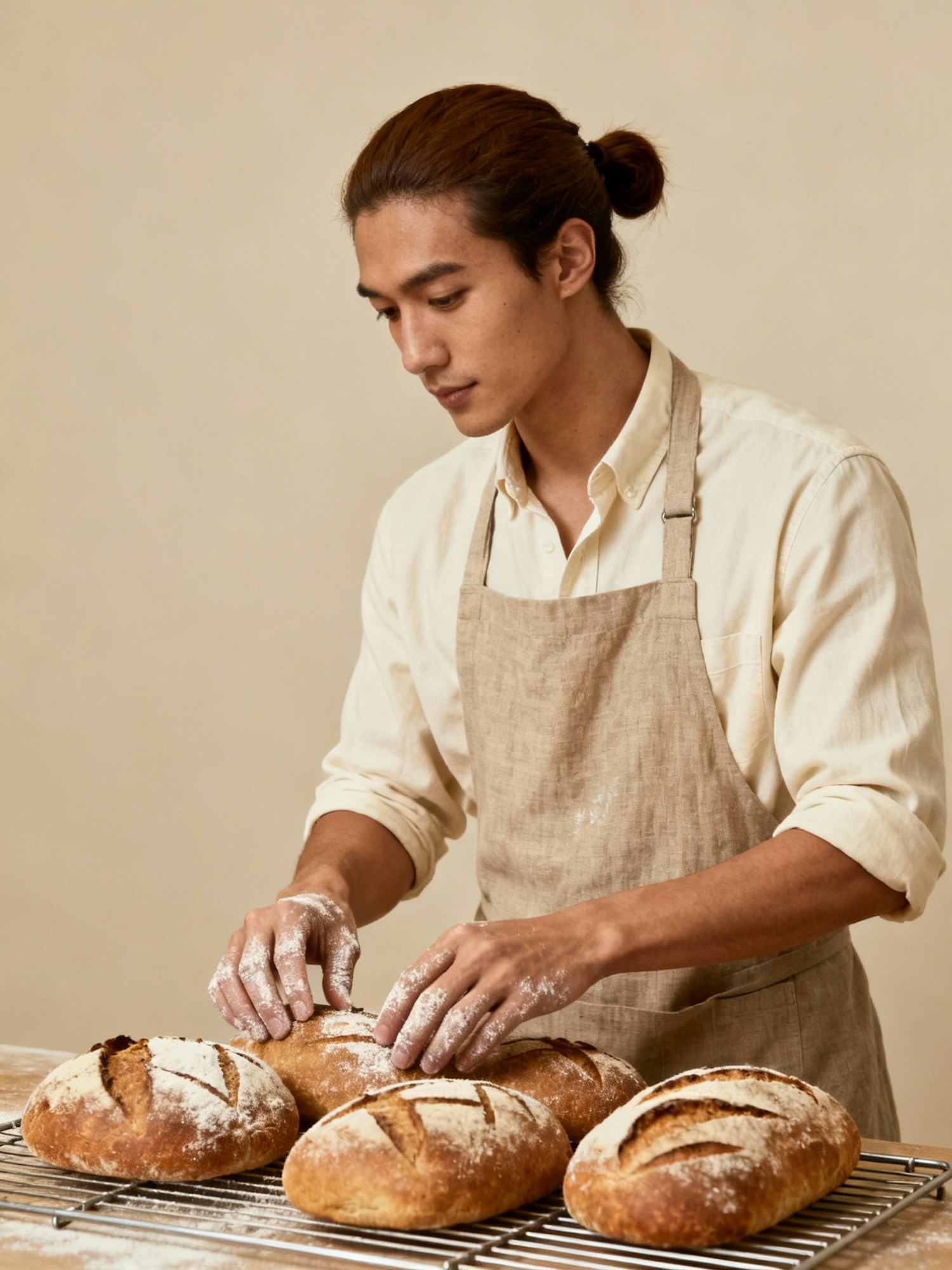 A baker arranging golden loaves of bread on a cooling rack, wearing a beige apron and a focused expression, with flour-dusted hands.