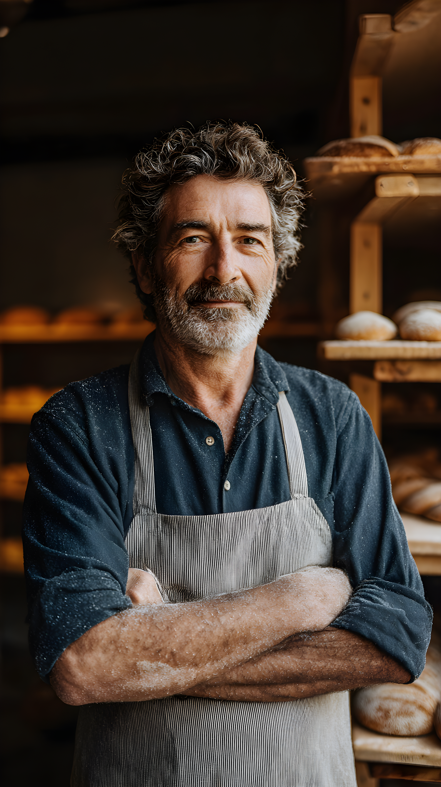 A baker with gray hair and a beard stands in his bakery, wearing a striped apron, with shelves of fresh bread in the background.