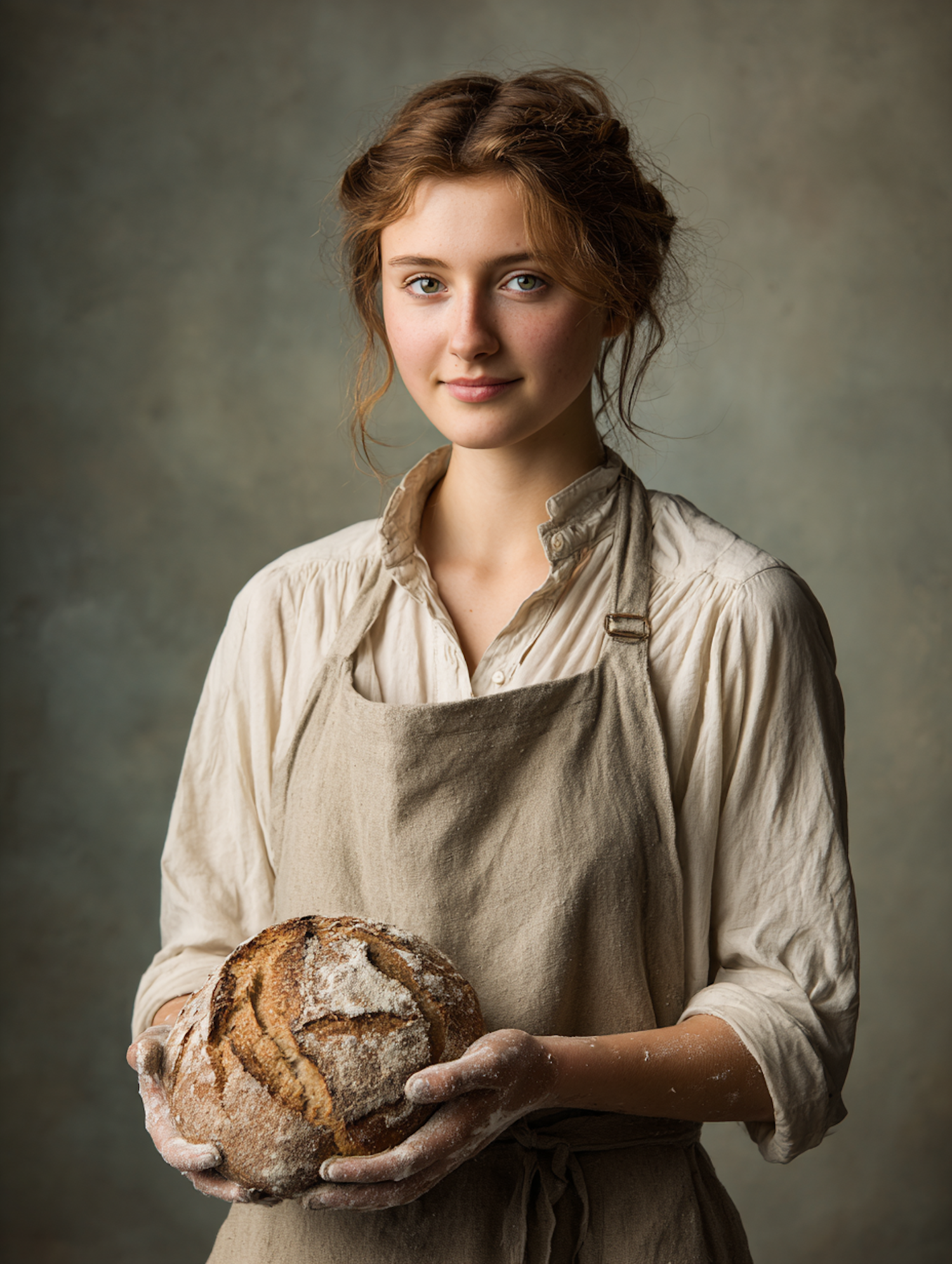 A young woman in a rustic apron holds a freshly baked loaf of bread, her hands dusted with flour, against a neutral background.