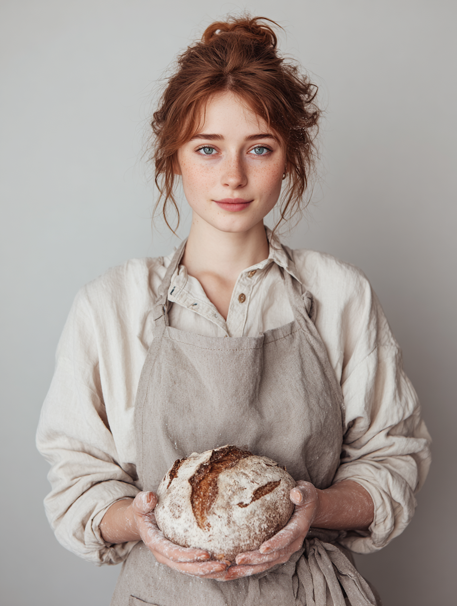 A young woman with red hair and freckles holds a rustic loaf of bread, wearing a beige apron and a calm expression against a neutral background.