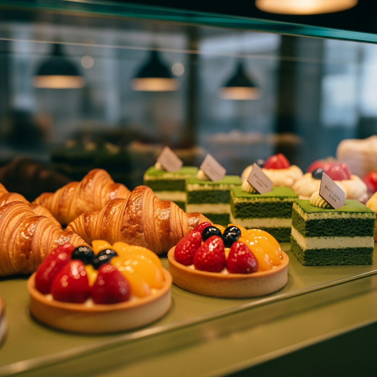 A bakery display with croissants, fruit tarts, and matcha cakes, beautifully arranged under warm lighting for a cozy ambiance.