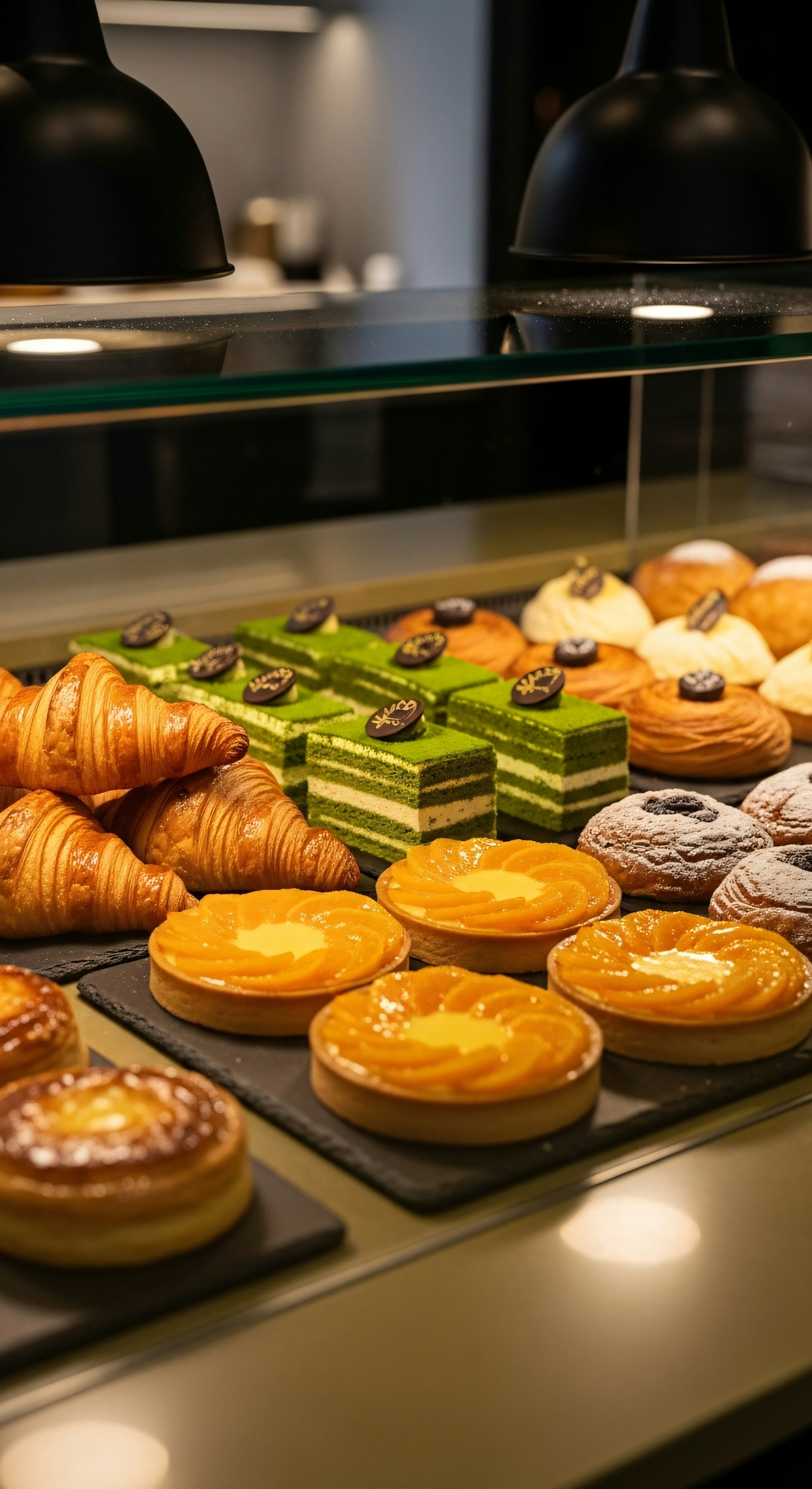 A tempting bakery display with croissants, matcha cakes, and fruit tarts under warm lighting, perfect for dessert lovers.