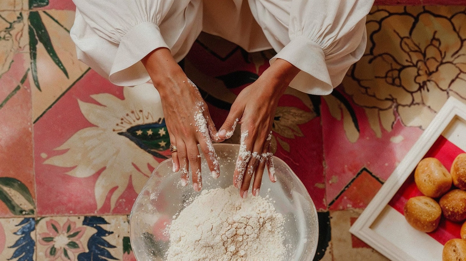 Hands mixing flour in a bowl on a colorful floor, with bread rolls nearby. Vibrant floral patterns create a rustic baking scene.