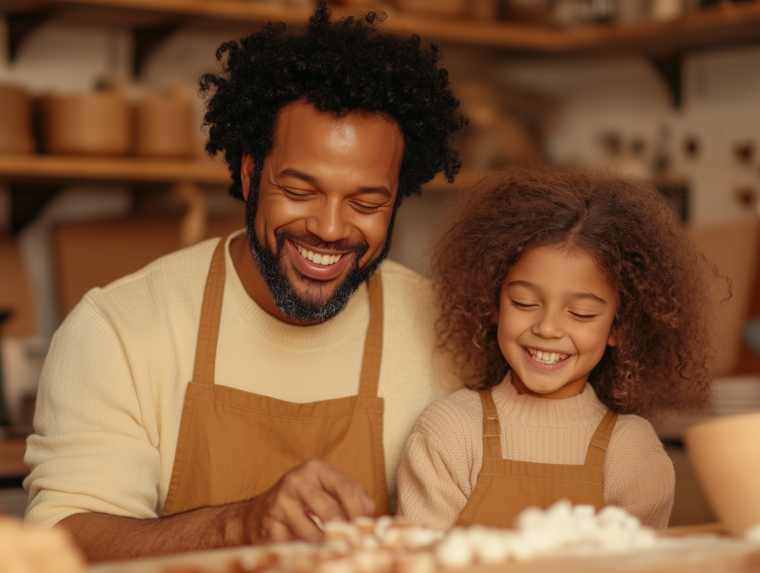 Father and daughter baking together, sharing smiles and joy in a cozy kitchen setting. Warm tones and familial bonding highlight the scene.