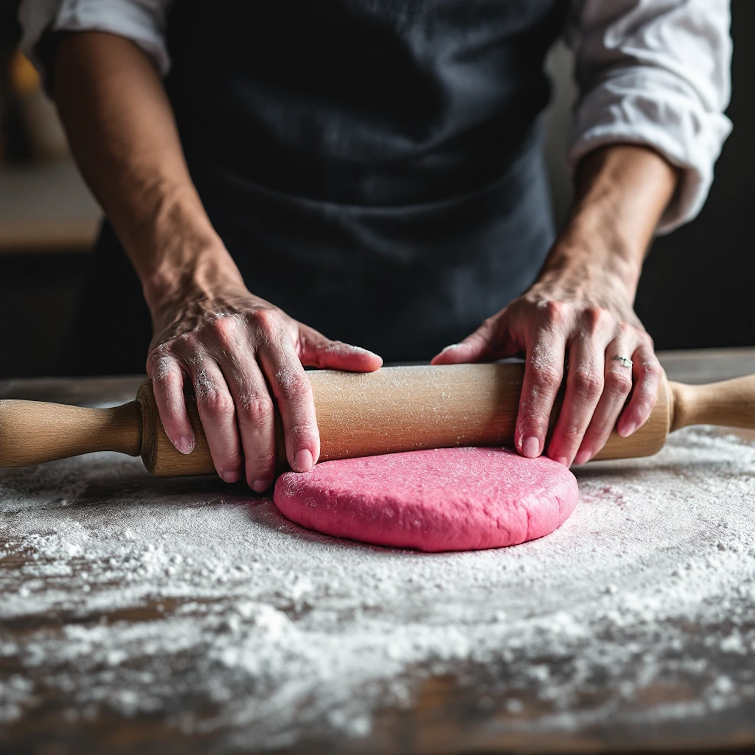 Hands rolling pink dough with a wooden rolling pin on a floured surface, wearing a black apron and white shirt.