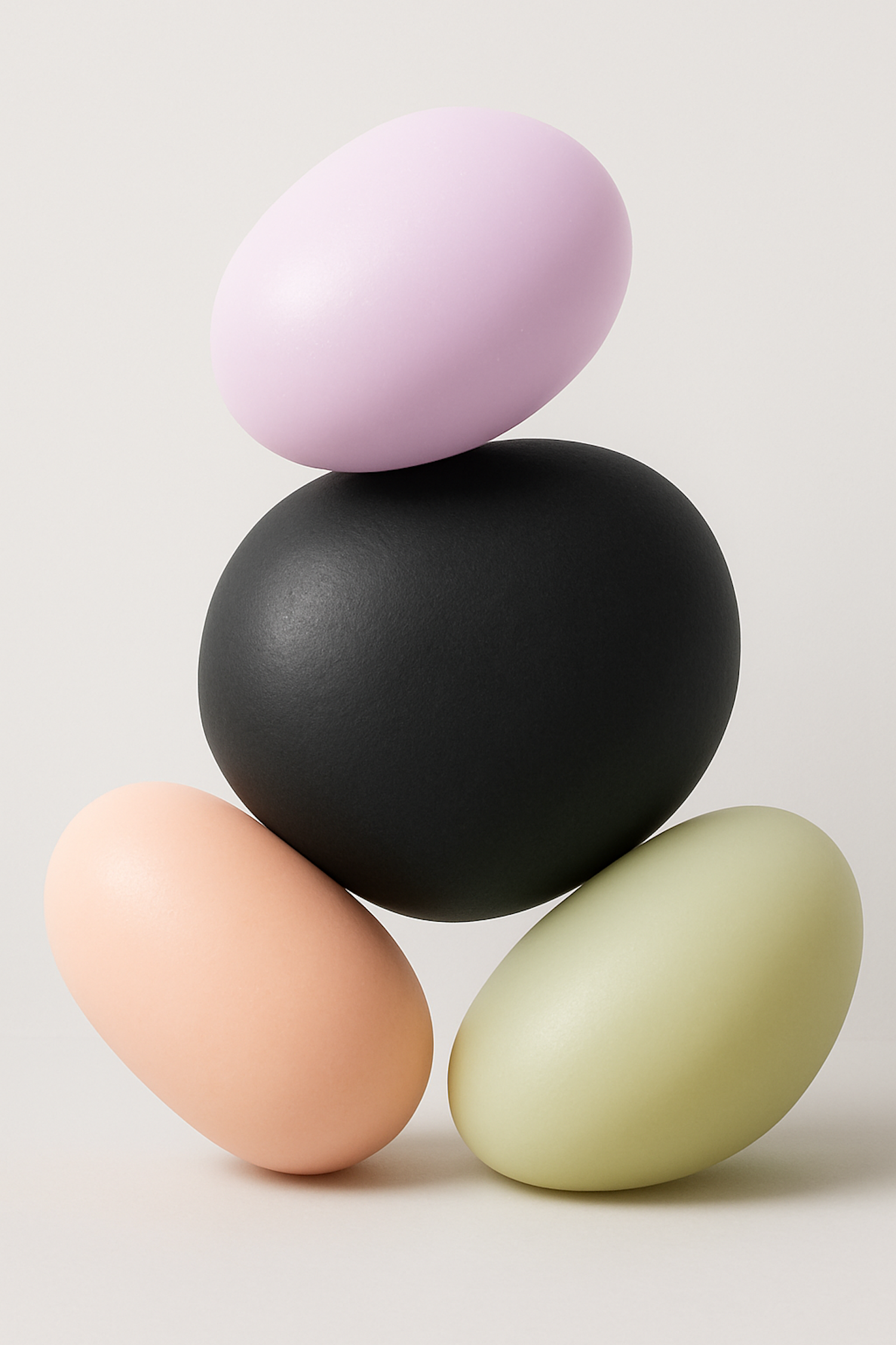 A stack of pastel-colored smooth eggs, featuring lavender, peach, green, and black tones, on a light background.