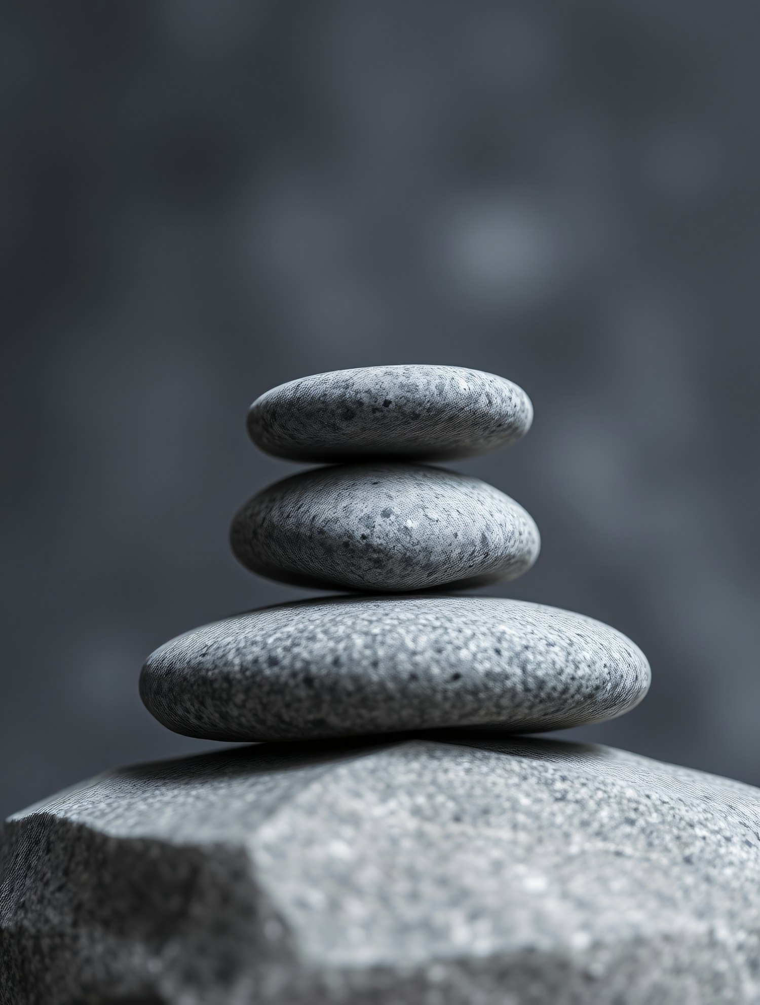 A serene stack of three smooth, gray stones against a blurred gray background, conveying tranquility and balance.