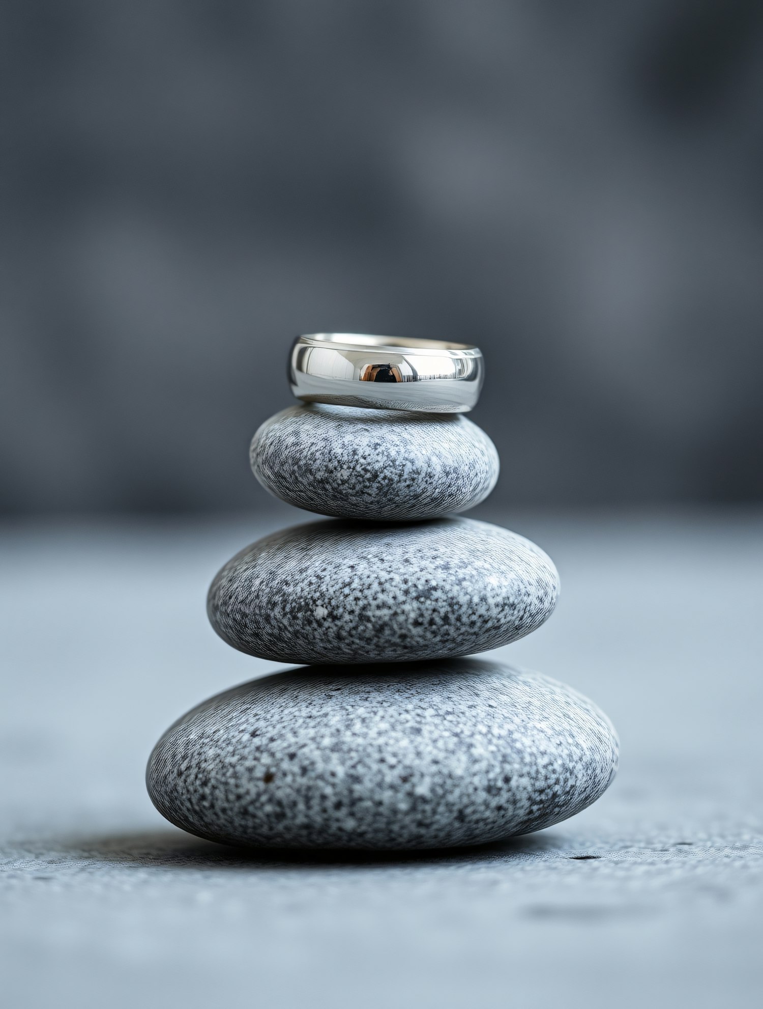 Stacked gray pebbles with a polished silver ring on top, set against a blurred gray background, symbolizing balance and elegance.