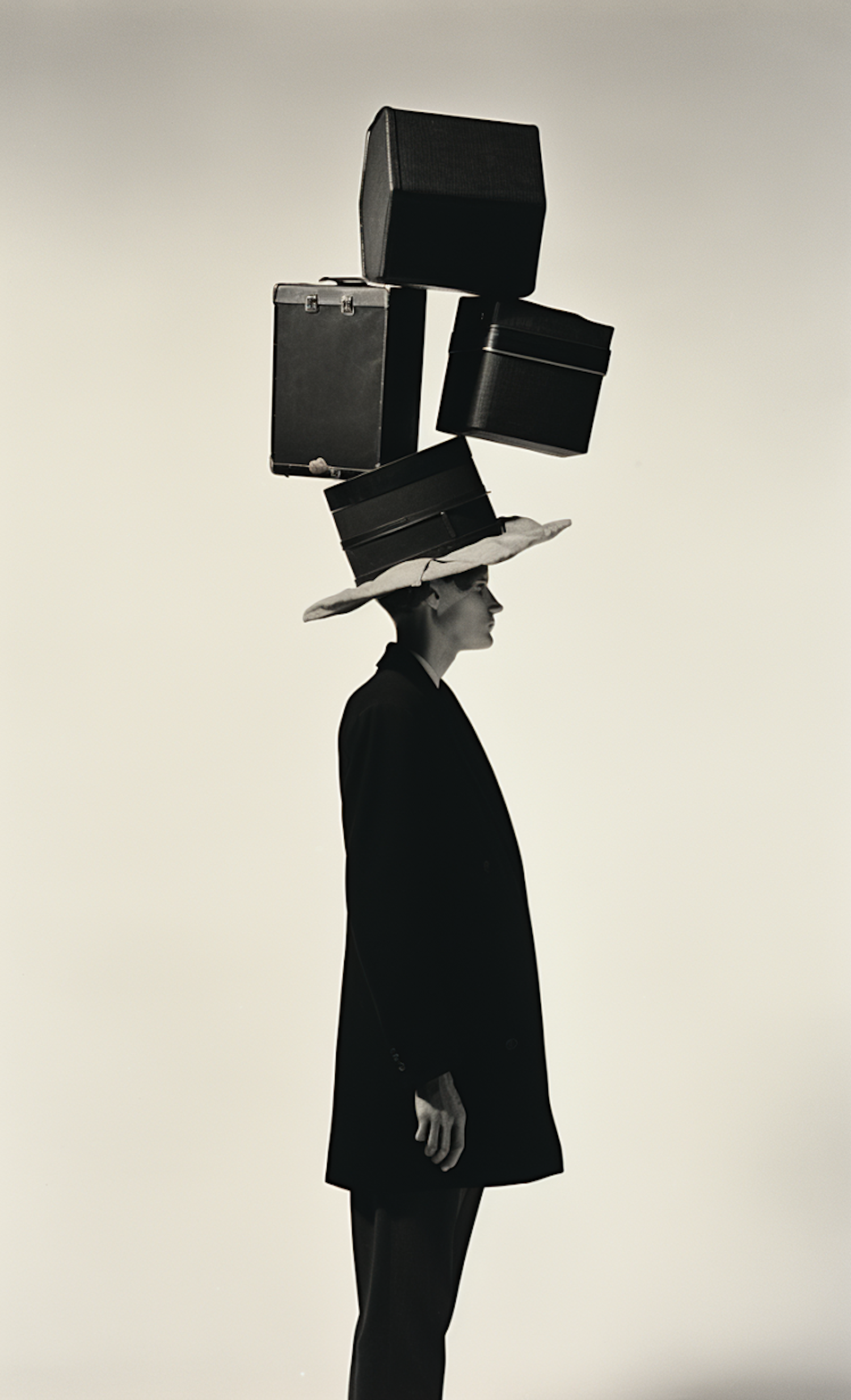Artistic black and white photo of a person balancing boxes on their head, creating a whimsical and minimalist composition.
