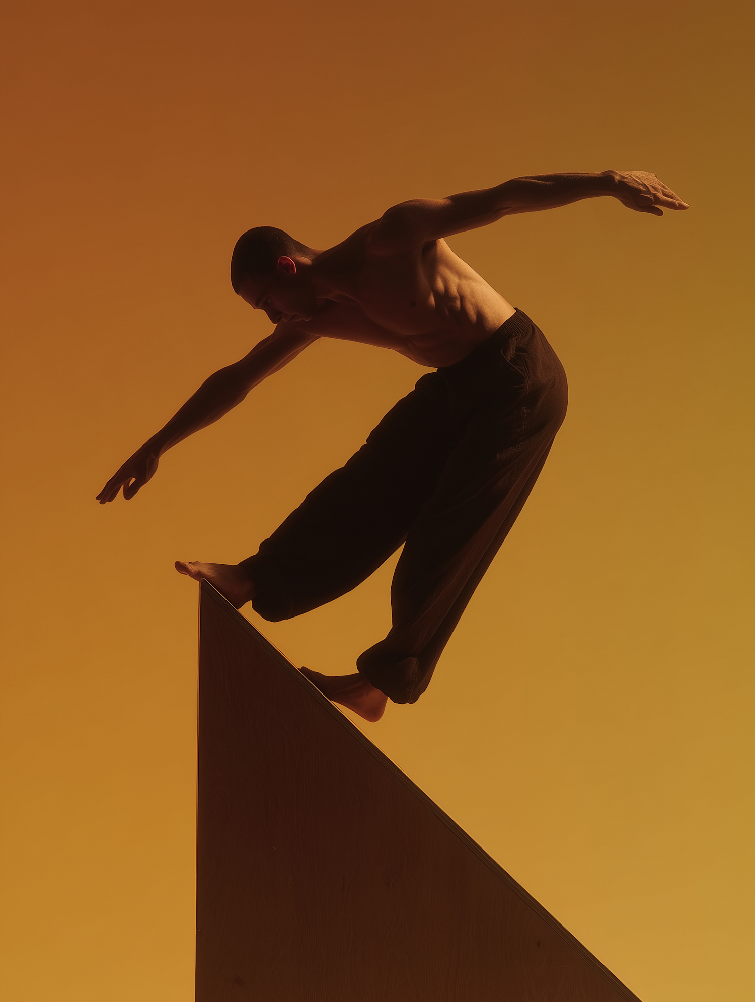 A person balances on a triangular structure against a warm orange background, showcasing grace and strength in a dramatic pose.