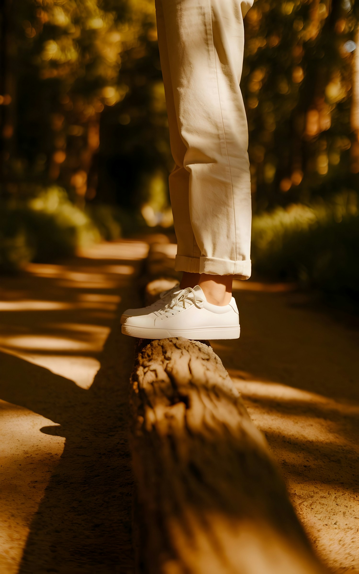 A person balances on a tree trunk in white sneakers and beige pants, surrounded by warm sunlight and a peaceful forest setting.