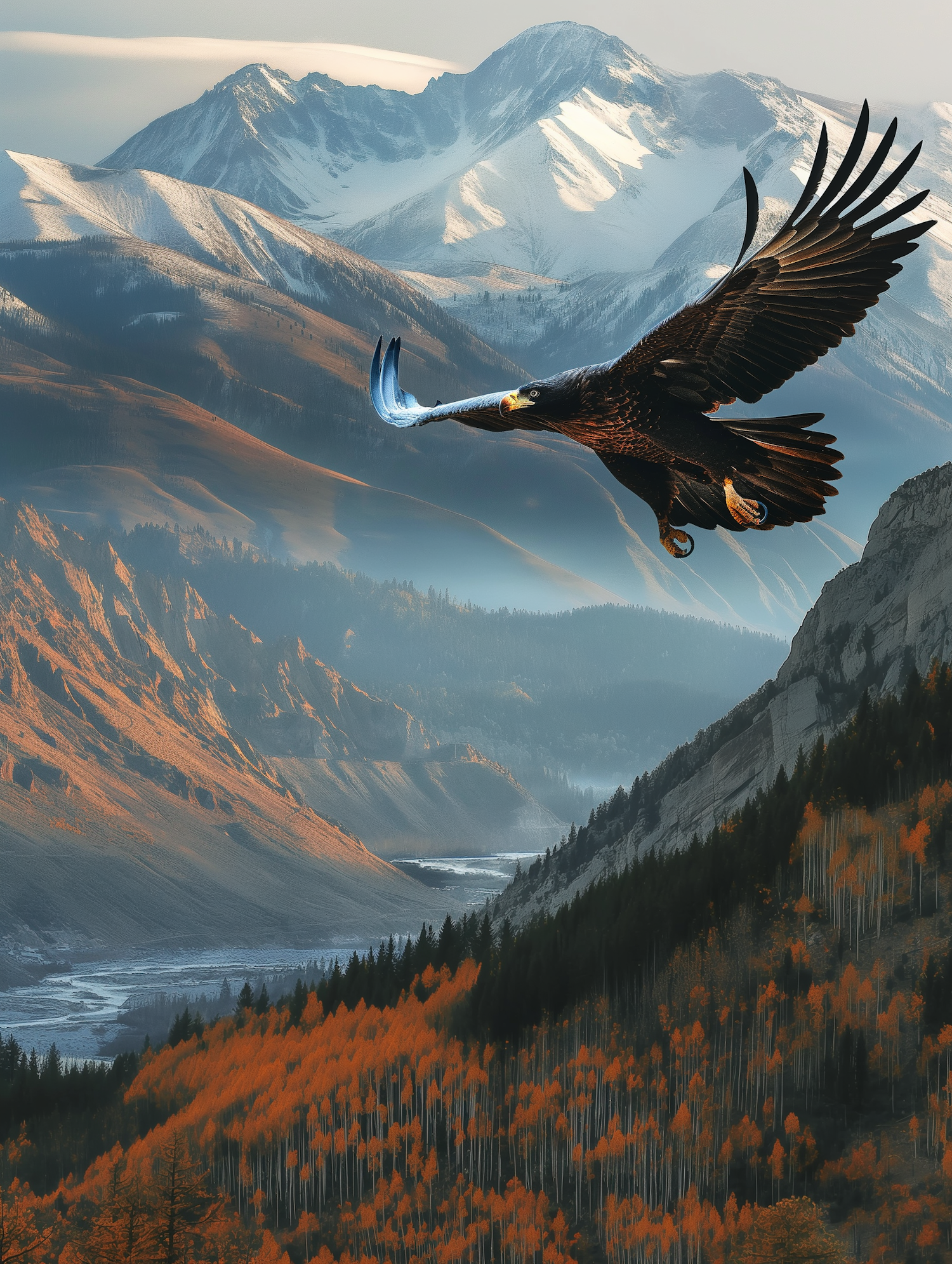 Majestic eagle soaring over a vibrant autumn forest with snow-capped mountains in the background, symbolizing freedom and natural beauty.