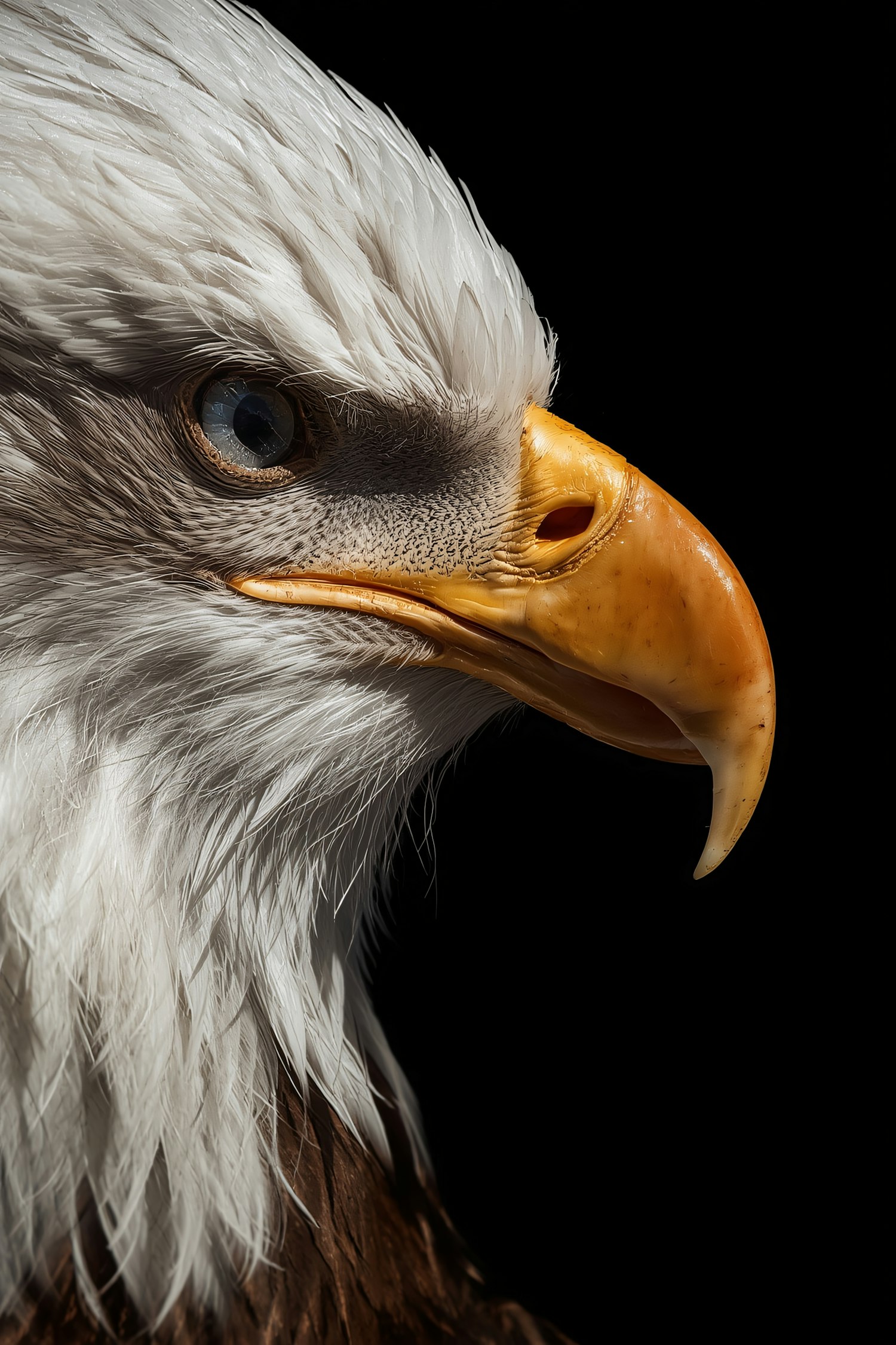 Close-up of a bald eagle's head with sharp details of its beak, eye, and feathers, set against a black background.