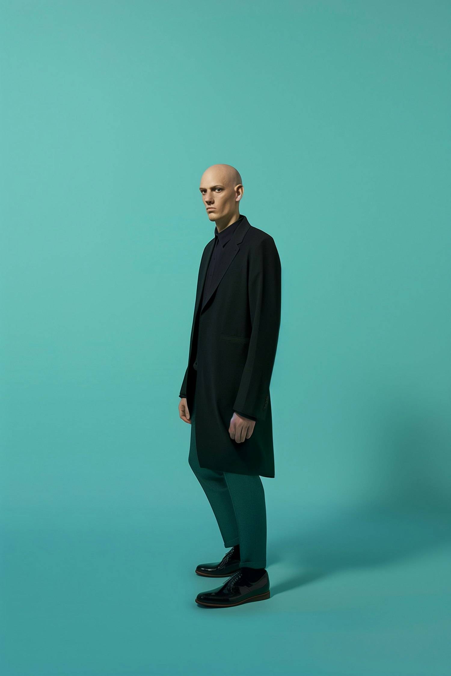 Bald man in a black coat and teal pants against a teal background, exuding a minimalist and modern style.