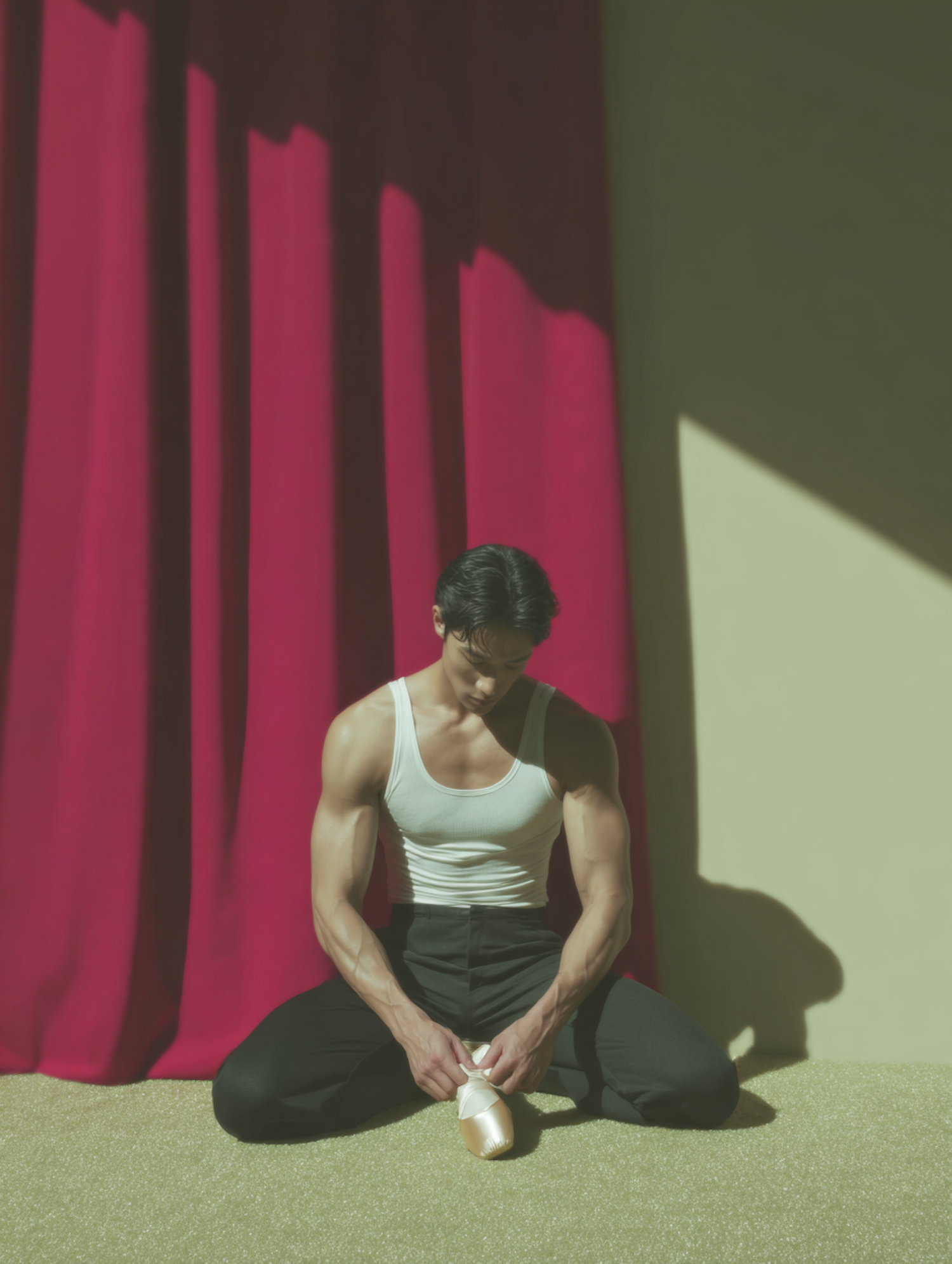 A male dancer in a white tank top ties ballet shoes against a red curtain backdrop, with dramatic lighting highlighting his form.