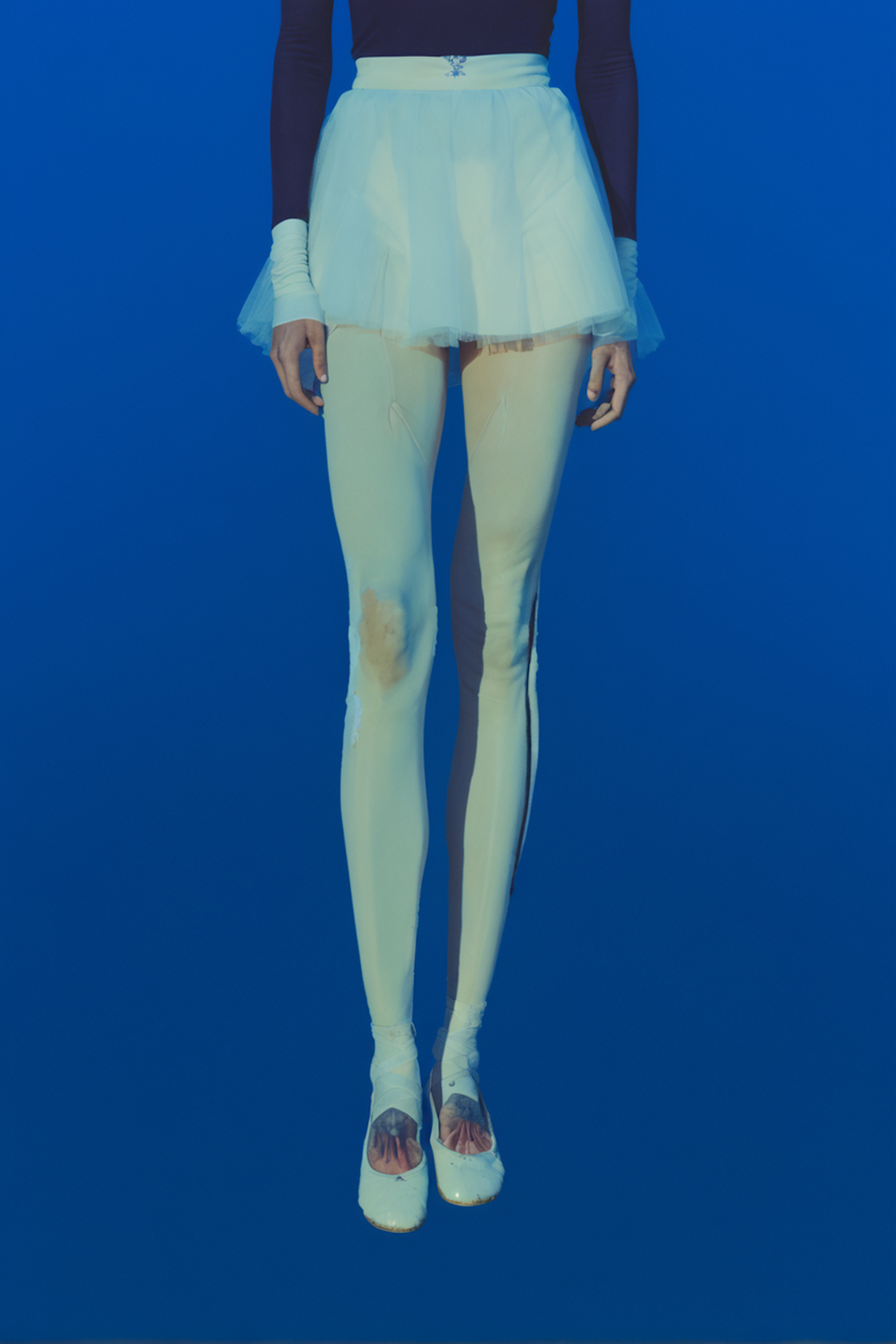 A ballet-inspired outfit with a tulle skirt, worn leggings, and white ballet shoes against a striking blue background.
