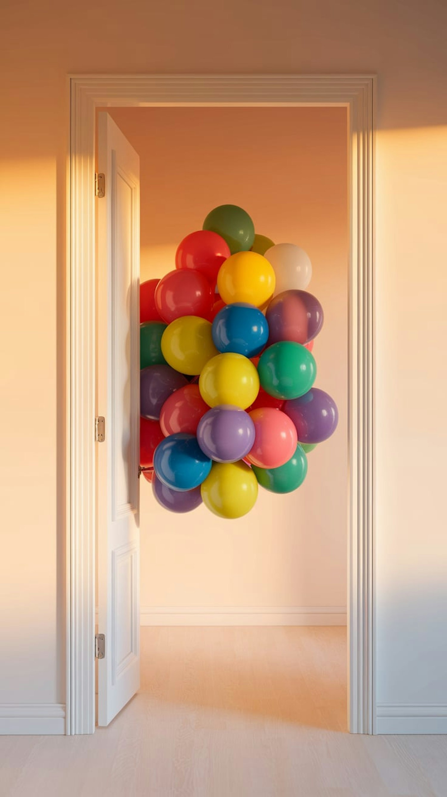 A cluster of colorful balloons spills through a white door, bathed in warm sunlight, creating a playful and whimsical vibe.