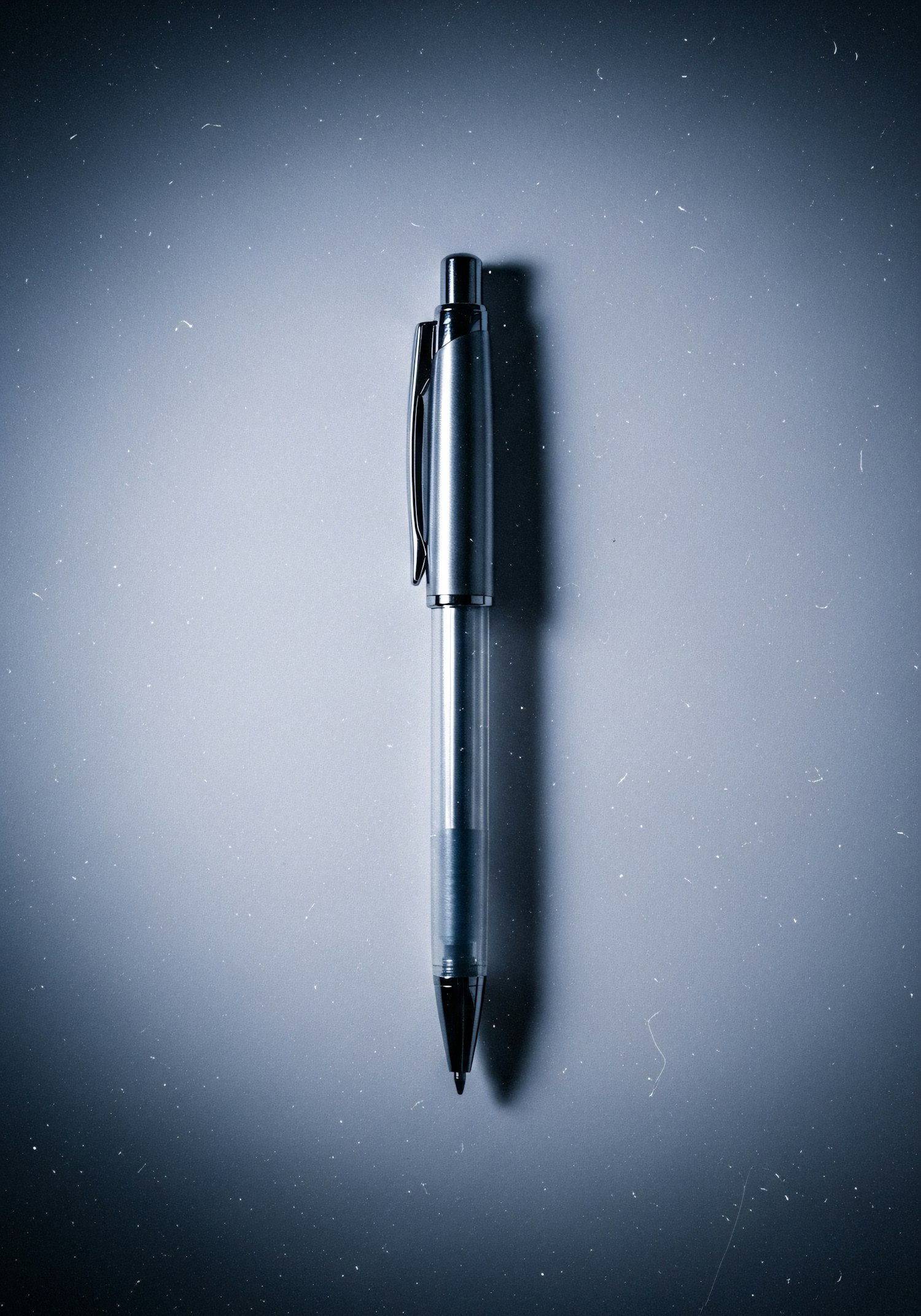 A sleek ballpoint pen on a reflective surface, with soft lighting and a minimalistic aesthetic.