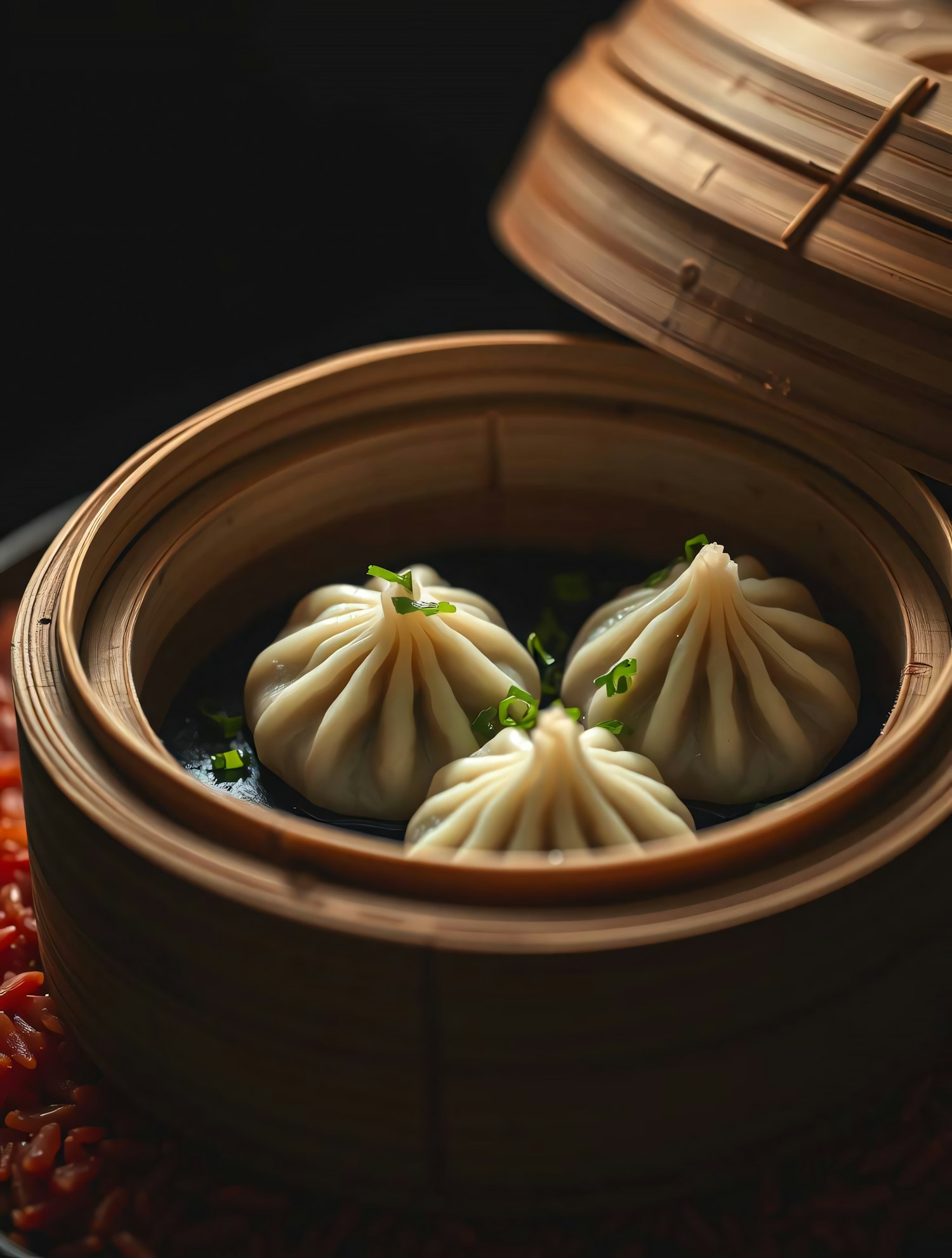 Steamed dumplings in a bamboo basket, garnished with herbs, set against a dark background for a warm, authentic presentation.