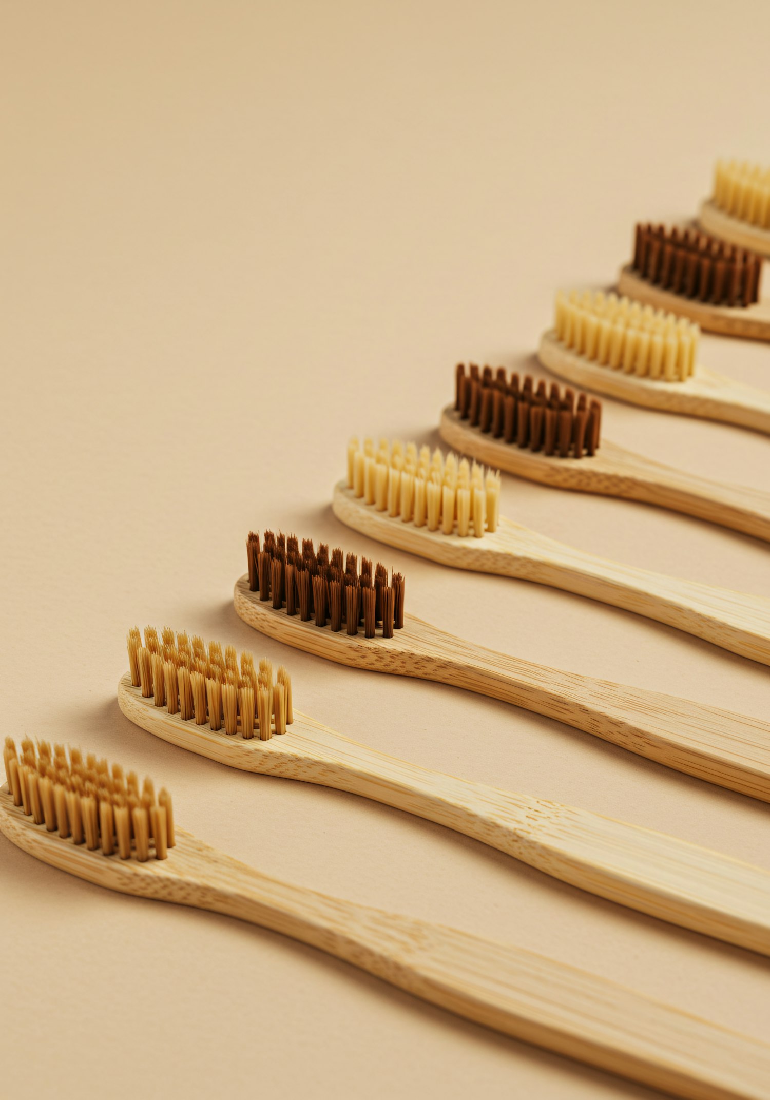 A set of bamboo toothbrushes with natural bristles in various shades, arranged on a beige background for a minimalist aesthetic.