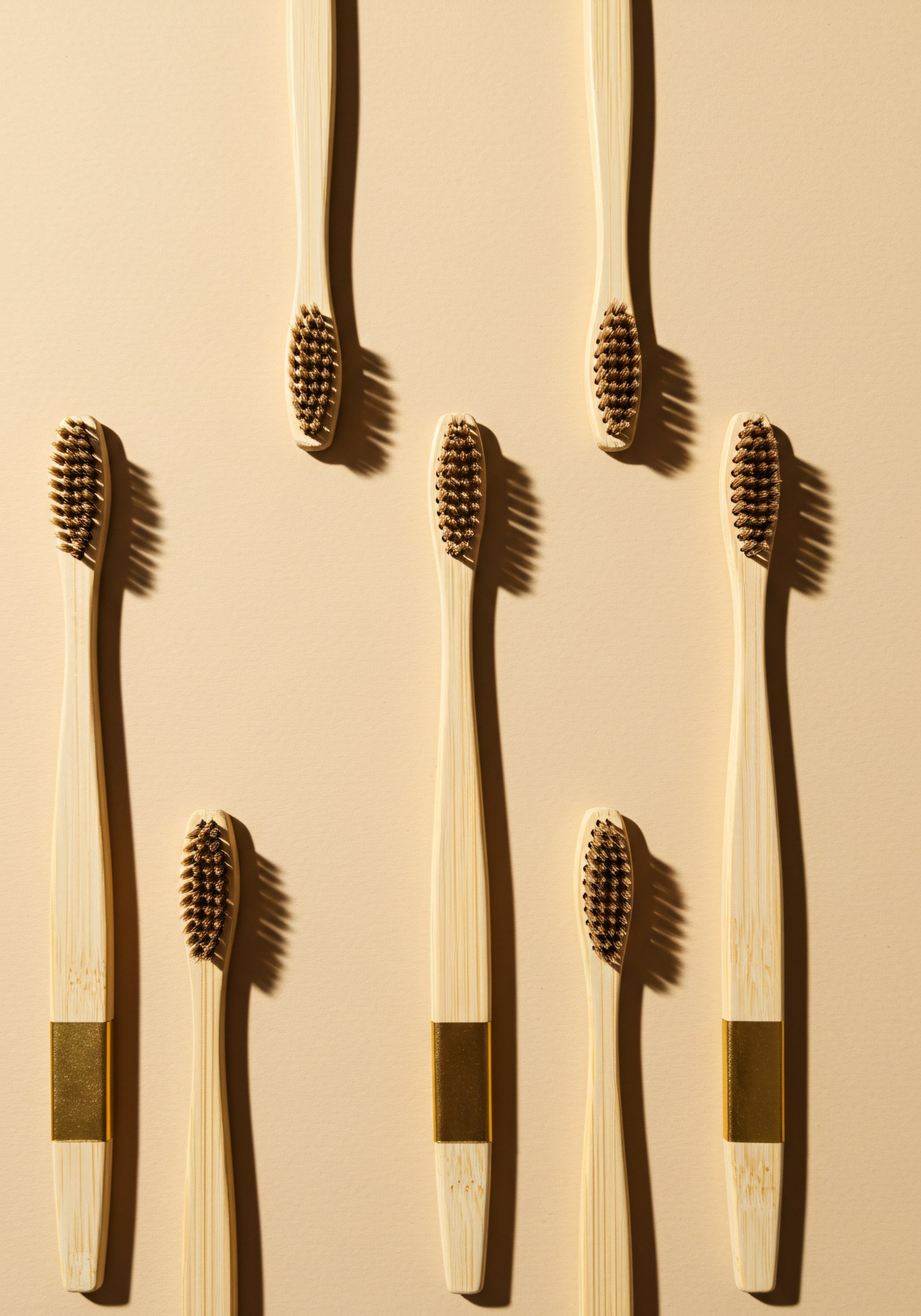 Eco-friendly bamboo toothbrushes arranged on a beige background, highlighting their natural texture and sustainable design.