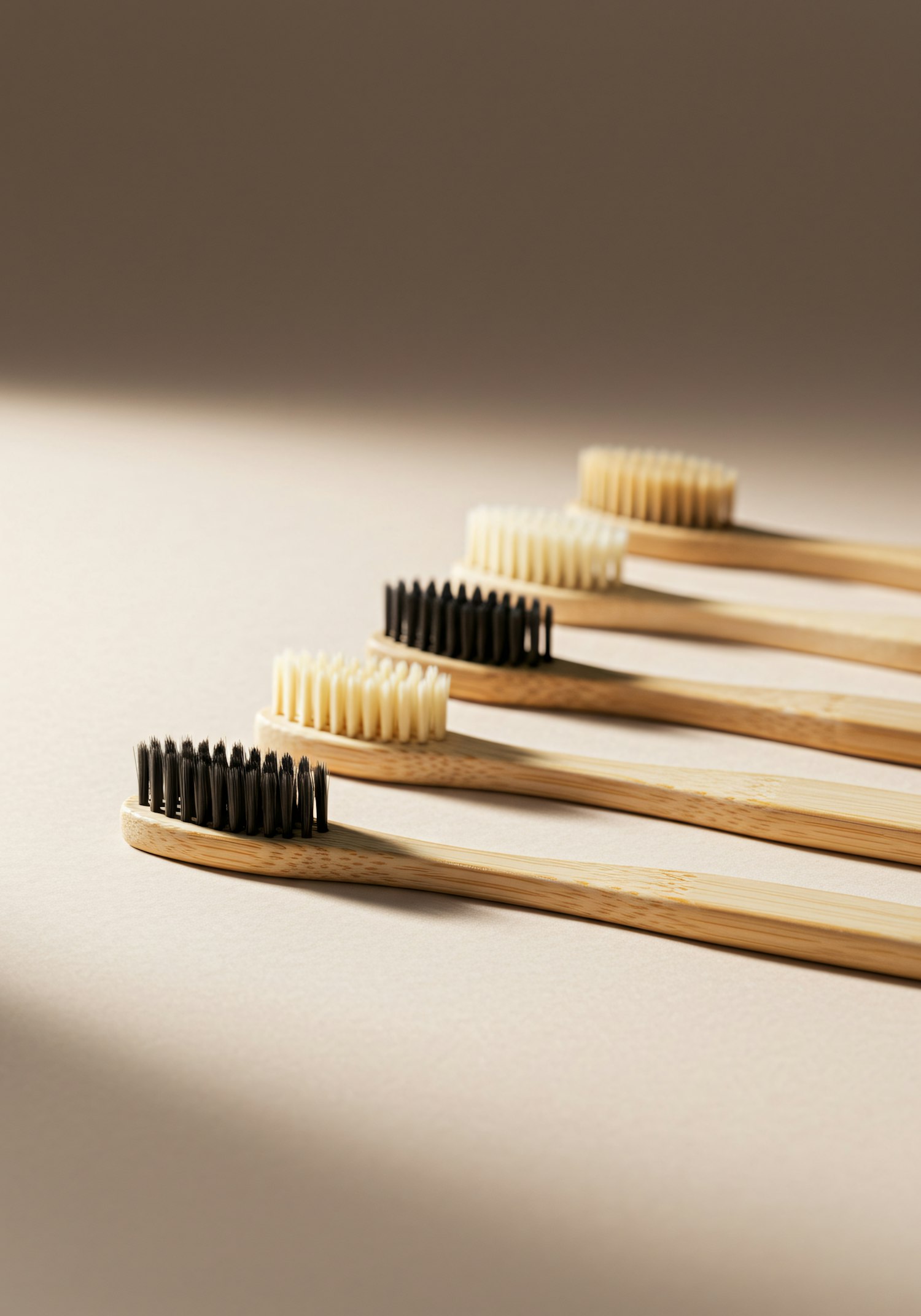 Eco-friendly bamboo toothbrushes with black and white bristles arranged on a neutral background, showcasing their natural design.