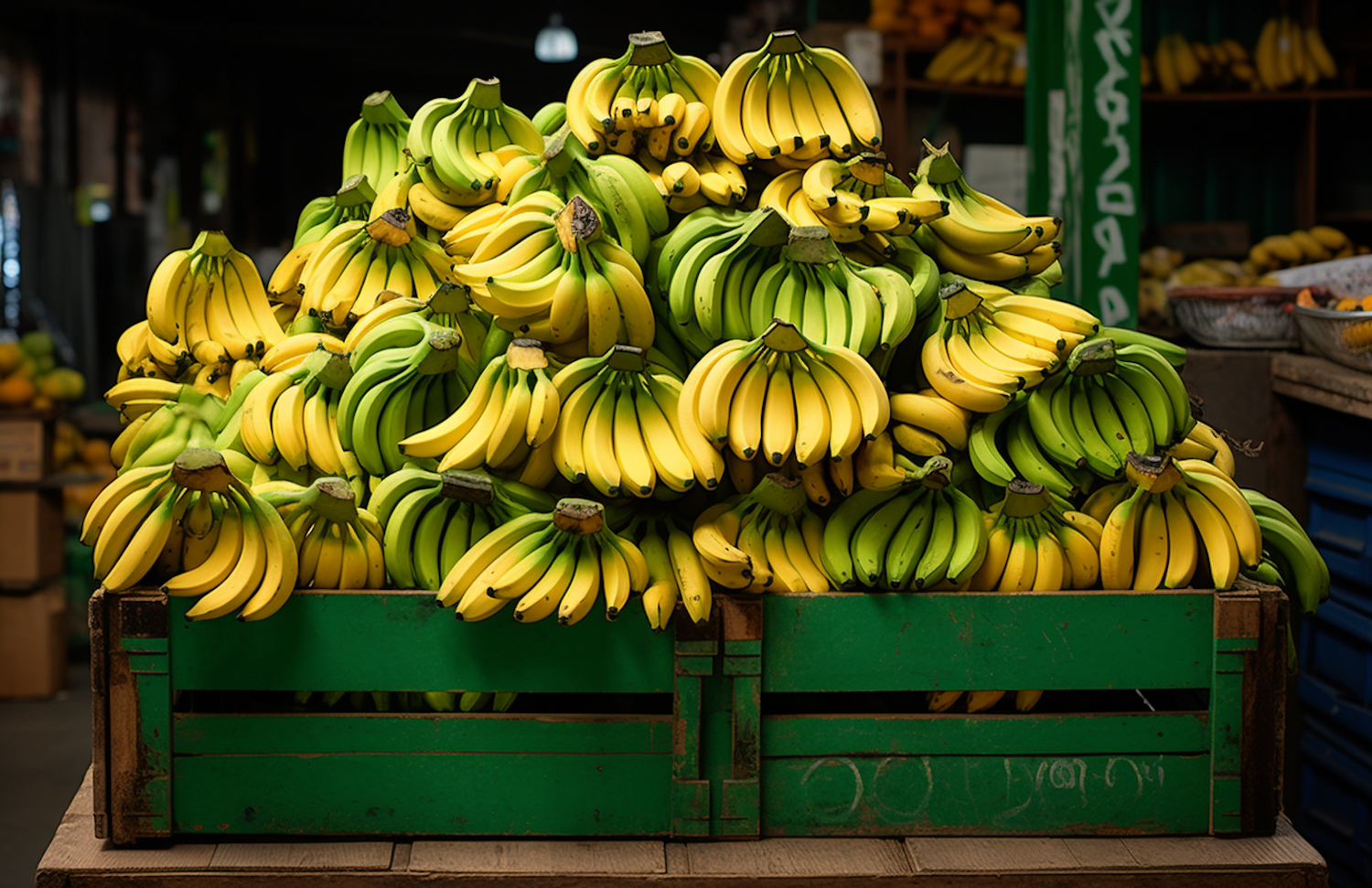 A vibrant display of bananas in a green crate, showcasing a mix of ripe yellow and green bananas at a market.