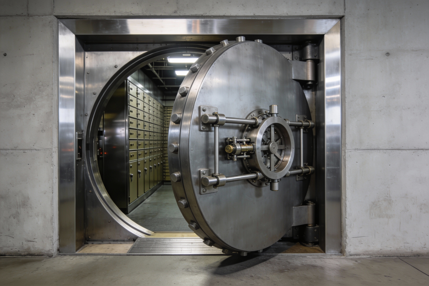 A massive steel vault door stands open, revealing rows of safety deposit boxes inside a secure, well-lit room.