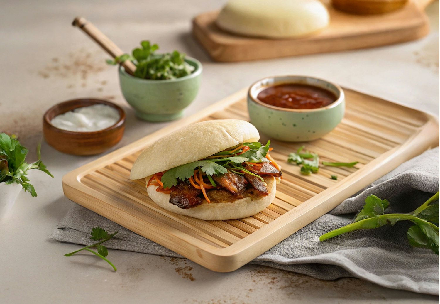 Delicious bao bun with grilled meat, fresh cilantro, and carrots on a wooden tray, surrounded by sauces and garnishes for a perfect meal.