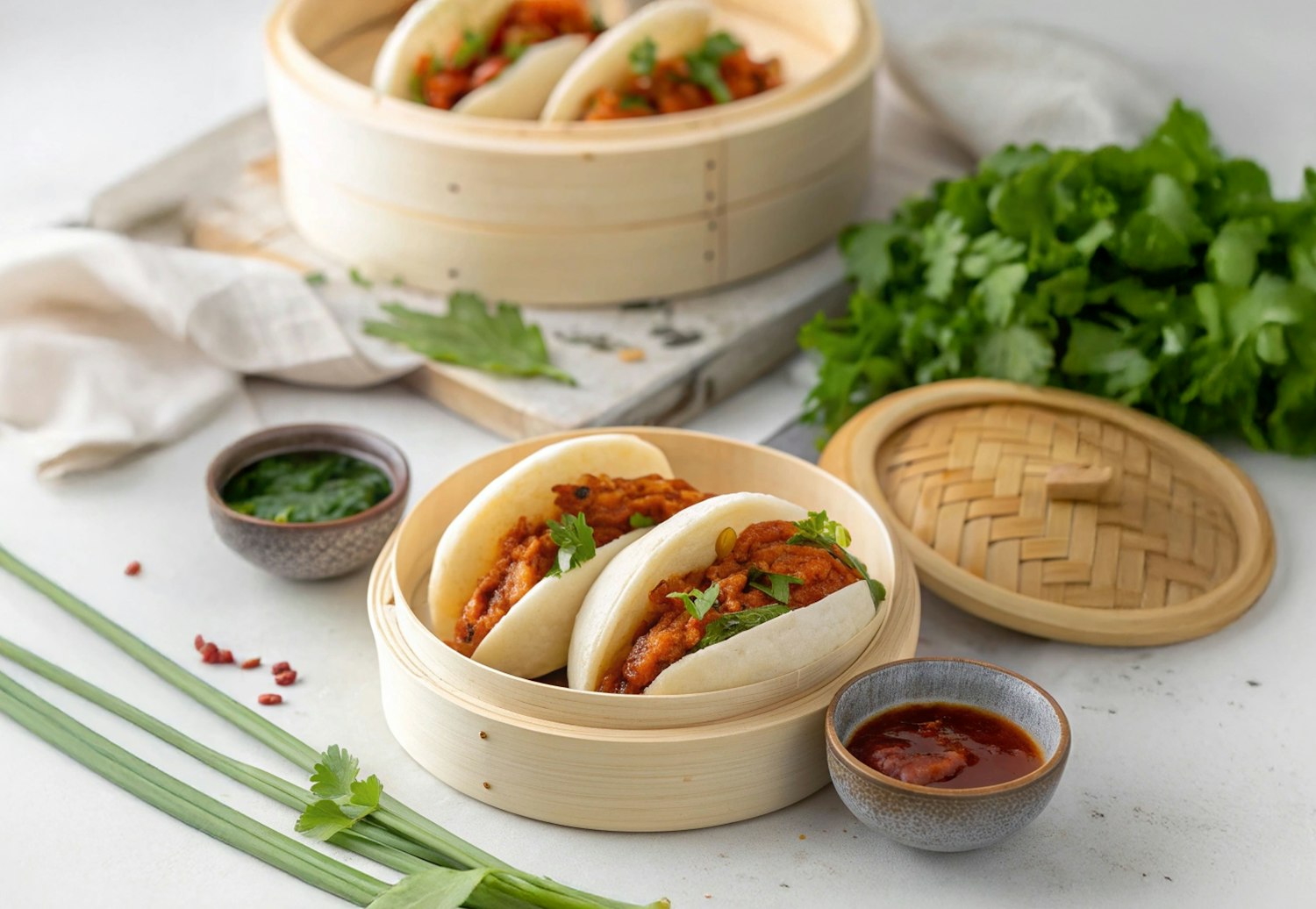 Delicious bao buns with savory filling, served in a bamboo steamer with fresh herbs and dipping sauces, perfect for a flavorful meal.