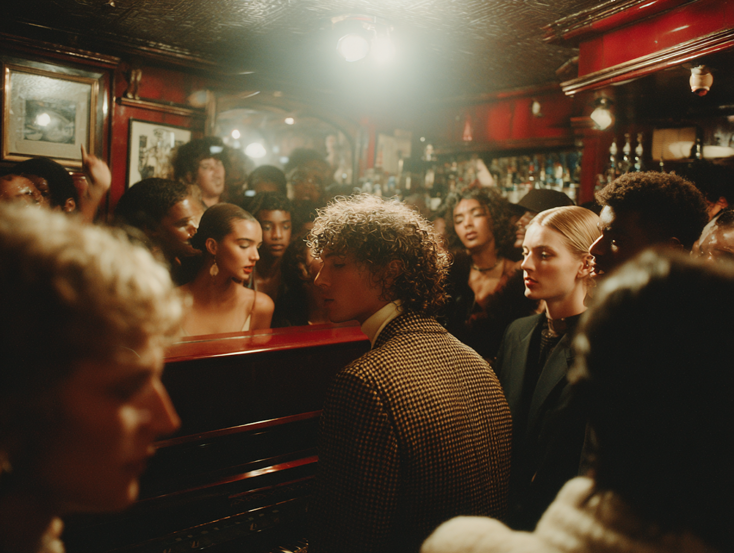 A vibrant bar scene with a diverse group of people enjoying a lively social gathering in a warmly lit, intimate setting.