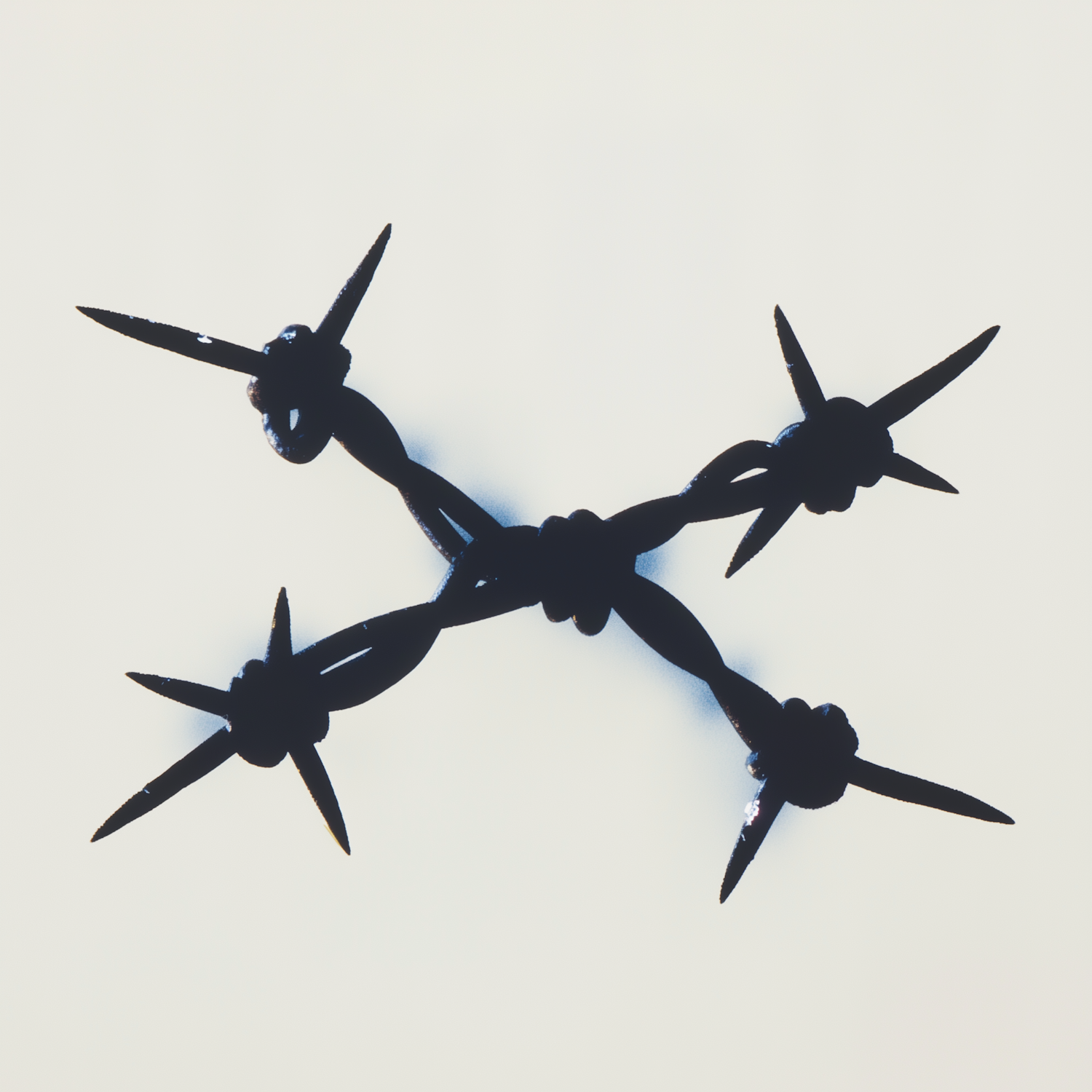 Close-up of barbed wire in an 'X' shape against a light background, showcasing sharp details and a minimalist industrial vibe.