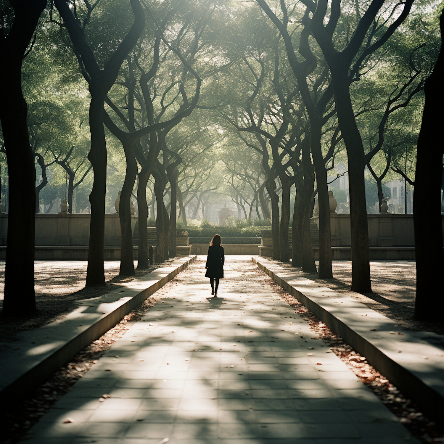 A solitary figure walks down a sun-dappled, tree-lined path, evoking tranquility and solitude in a serene park setting.